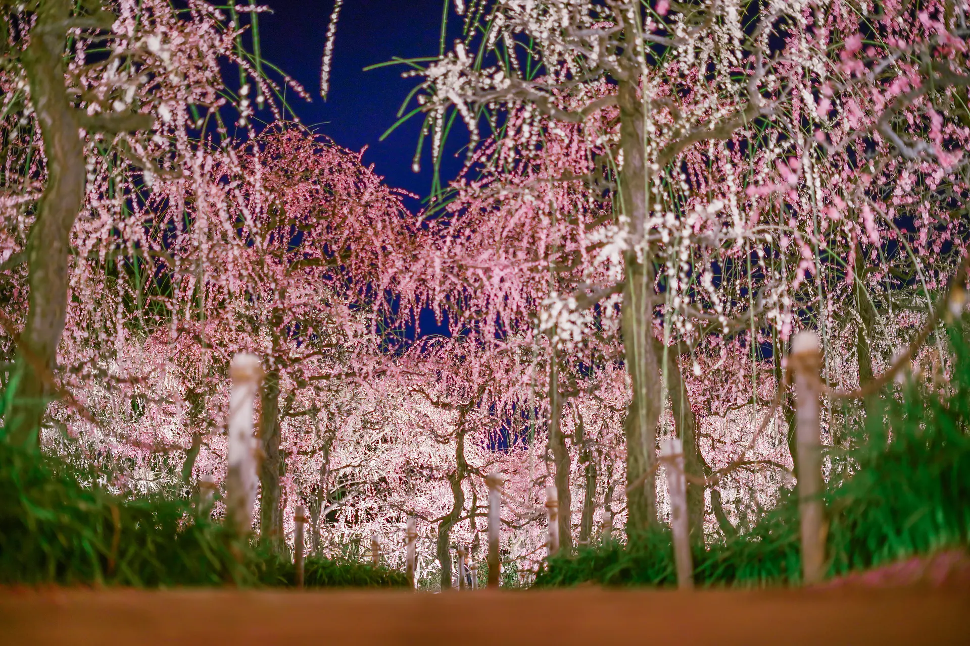 めずらしい夜の梅を楽しむことのできるライトアップの演出です。
