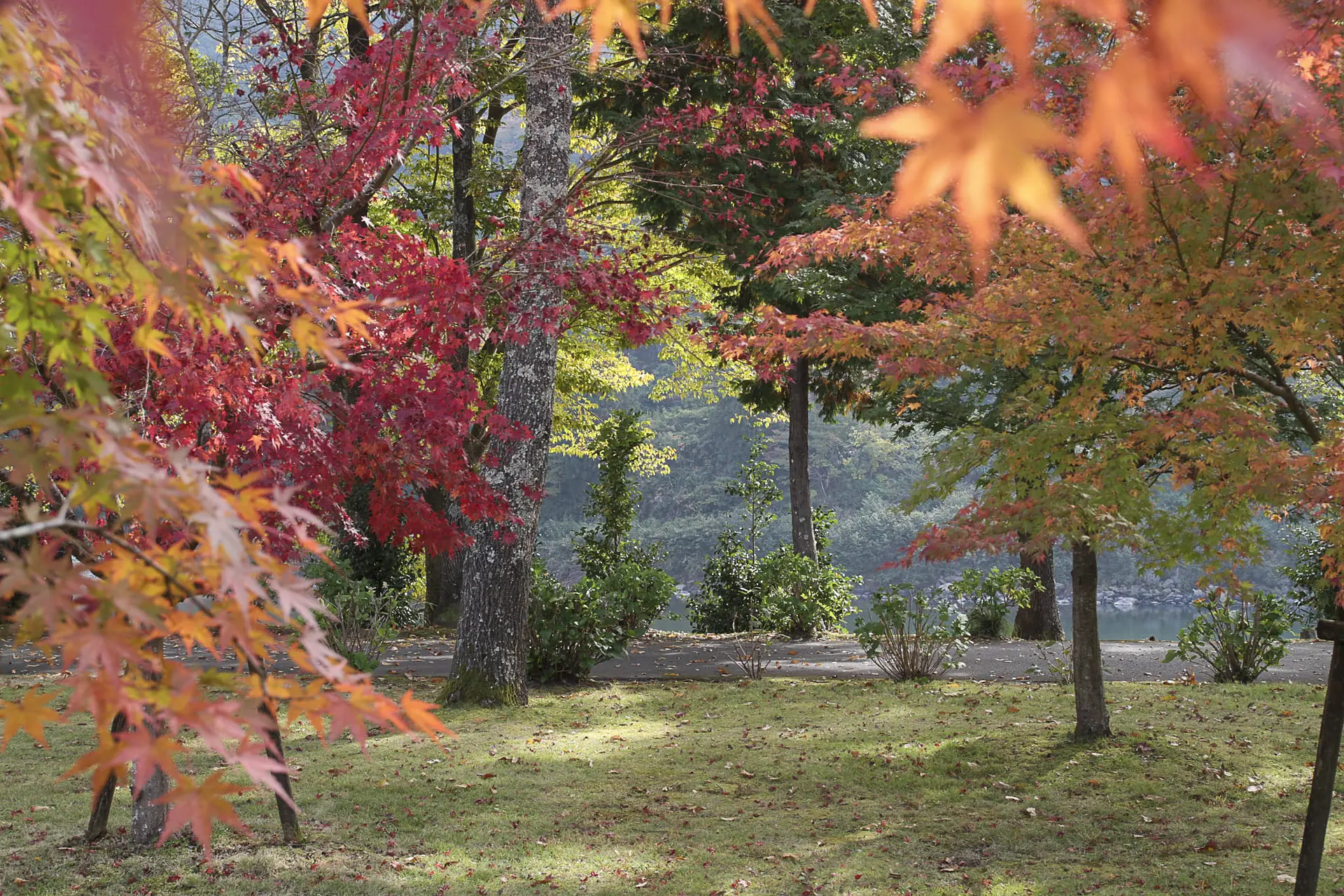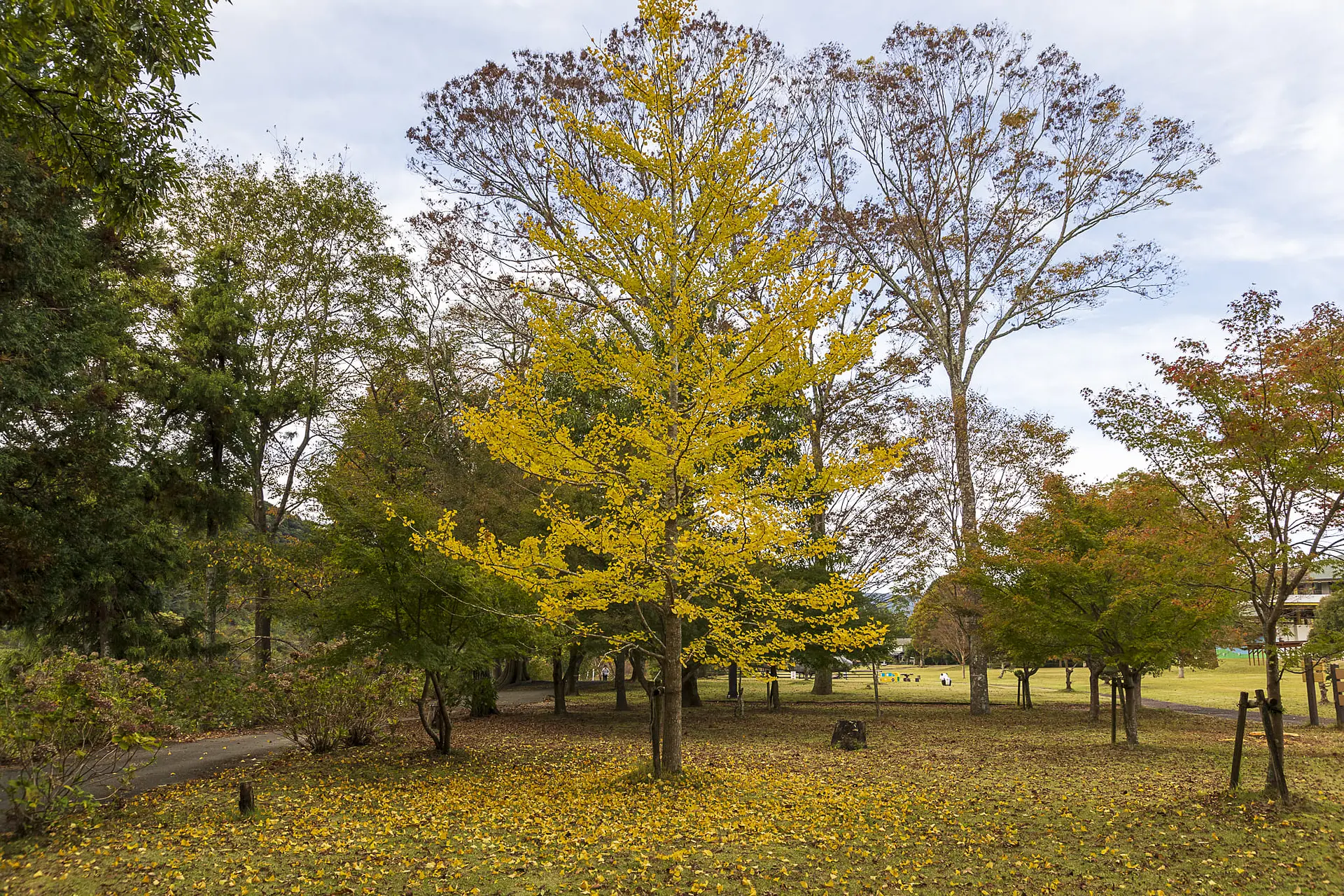 三重県度会町の宮リバー度会パークでは、11月中旬から12月上旬にかけて、イチョウやモミジの紅葉が見頃になります。