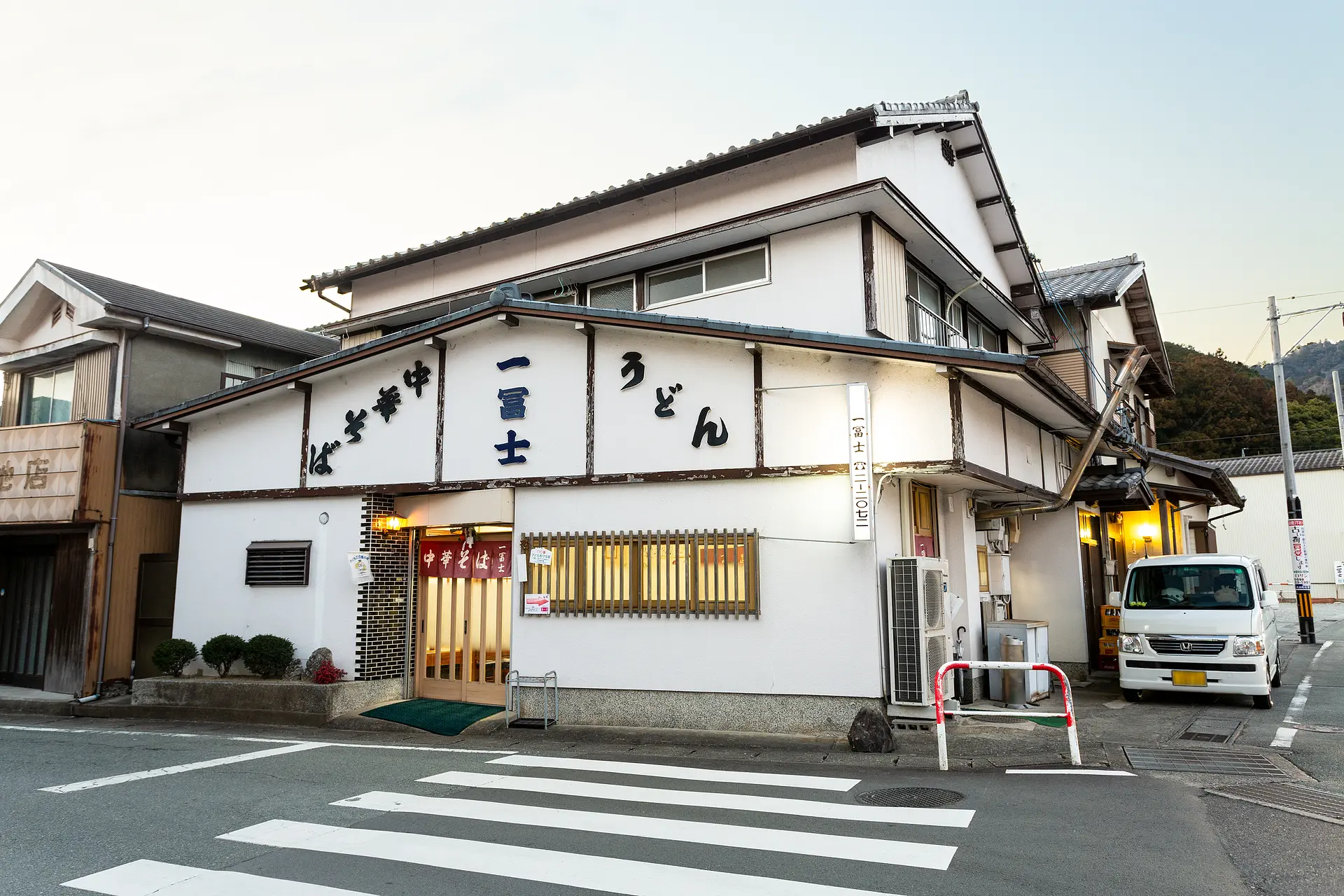 入り口は、店名をはさんで「中華そば」「うどん」と書かれた壁の下、のれんがある写真正面の引き戸ではなく、車の停まっている写真右側面にあります。