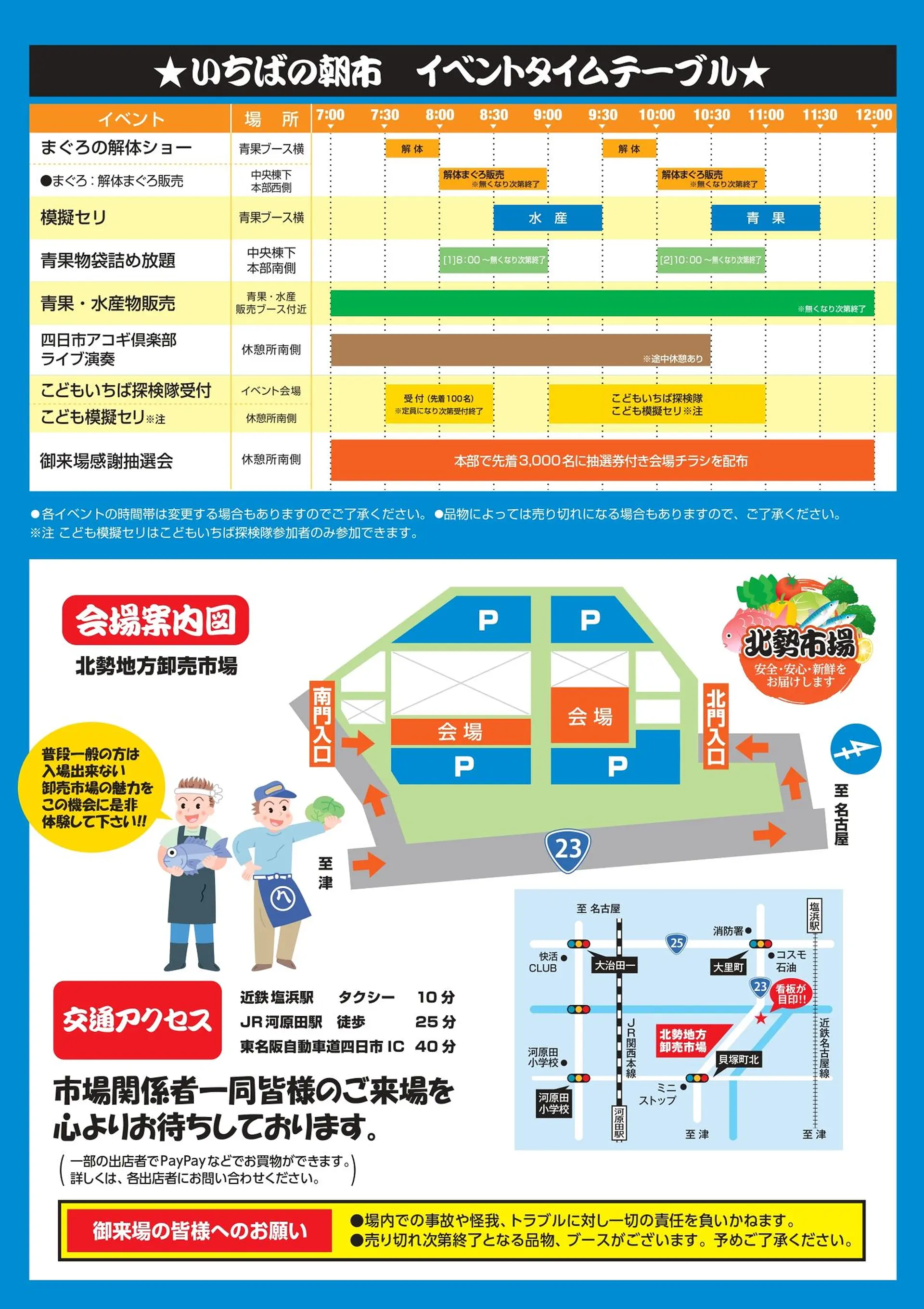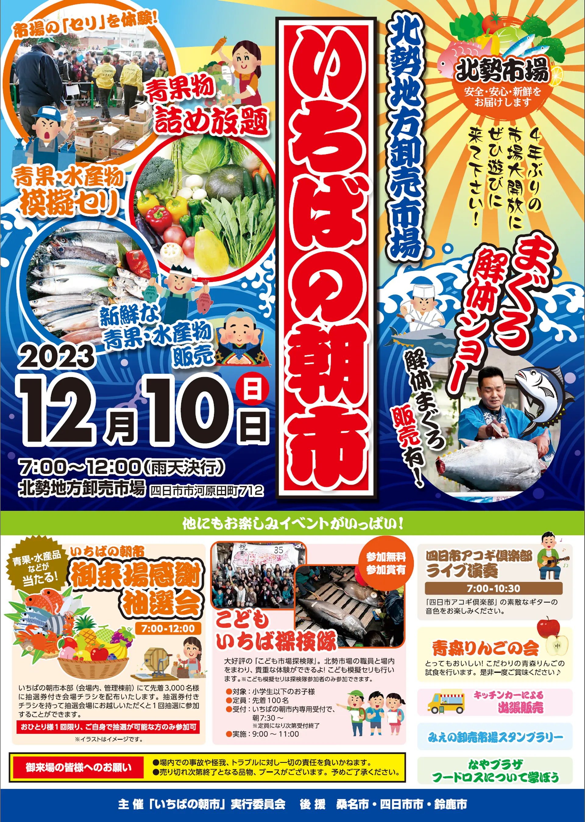 今年も新鮮な青果物・水産物の販売や模擬セリ・詰め放題・抽選会・こどもいちば探検隊など他にもイベントがいっぱいです!