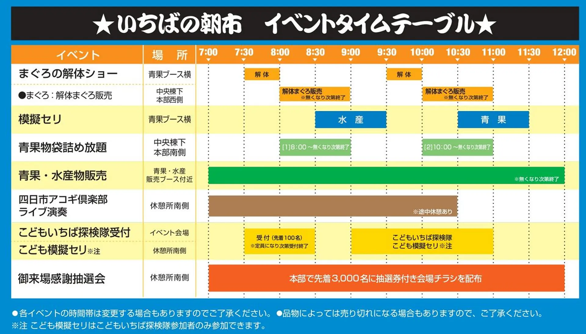 朝7時から12時までたくさんのイベントが同時開催されるのでタイムスケジュールを抑えてくださいね。
