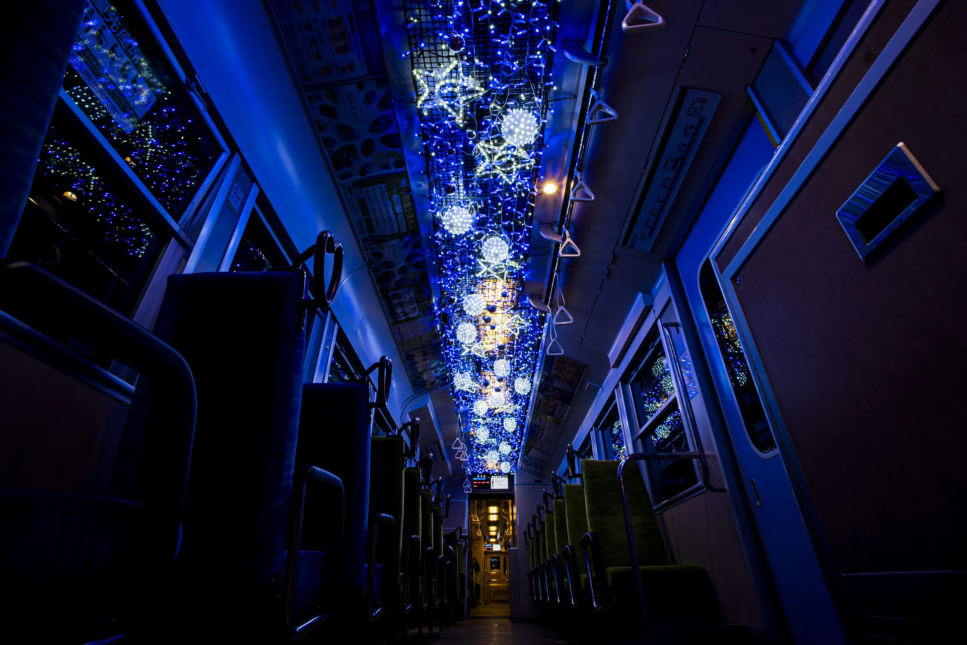 3両編成車両の真ん中、181号車に青色のイルミネーションが装飾されています。