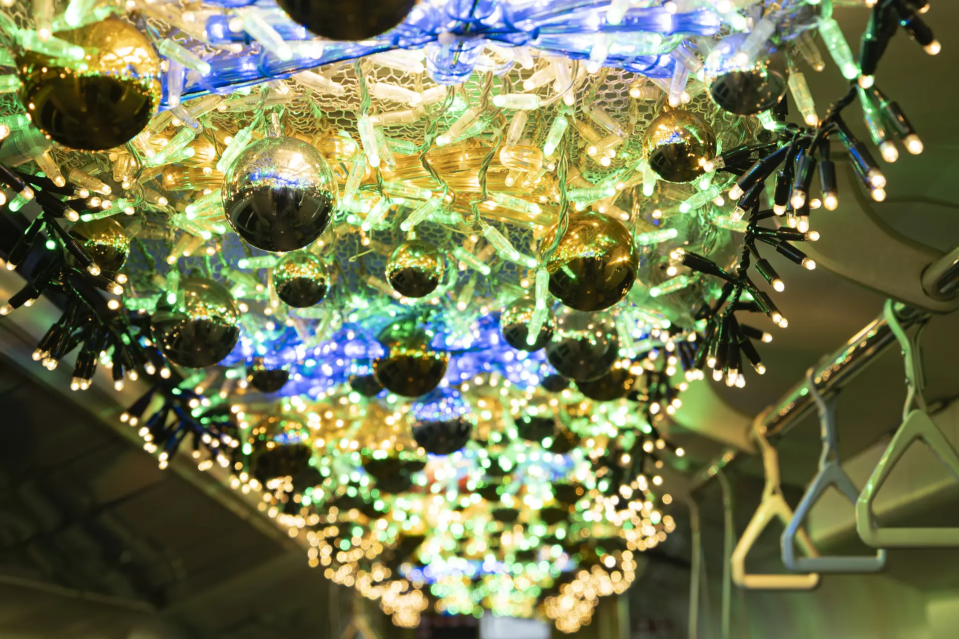 3両編成の真ん中、184号車に金色調のゴージャスなイメージのイルミネーションが装飾されています。