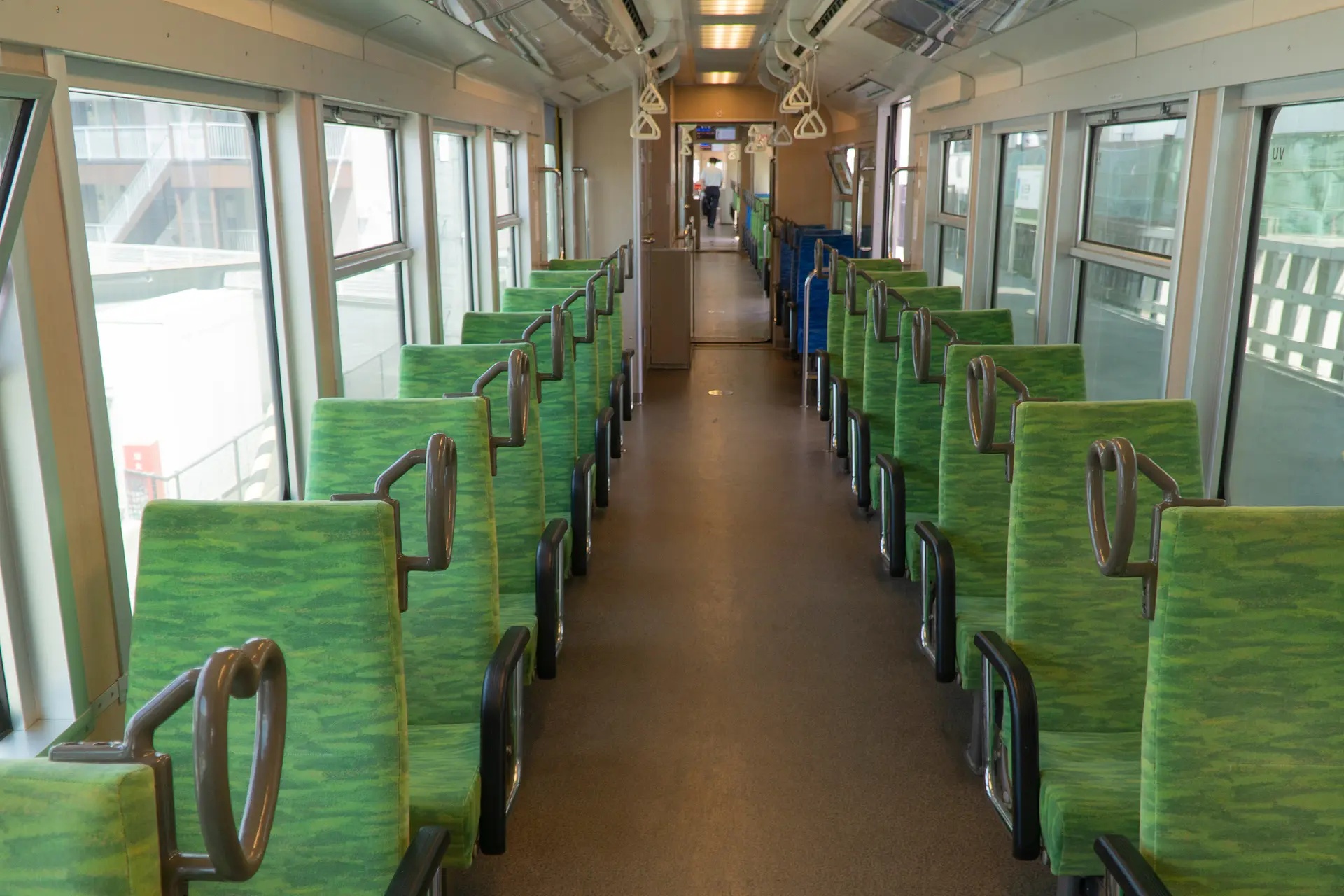 線路幅が狭いため、車内もコンパクト。バスの車内のような雰囲気です。友達同士で乗ると、距離感も近く感じますね。座席についているハート型の手すりがかわいいです。