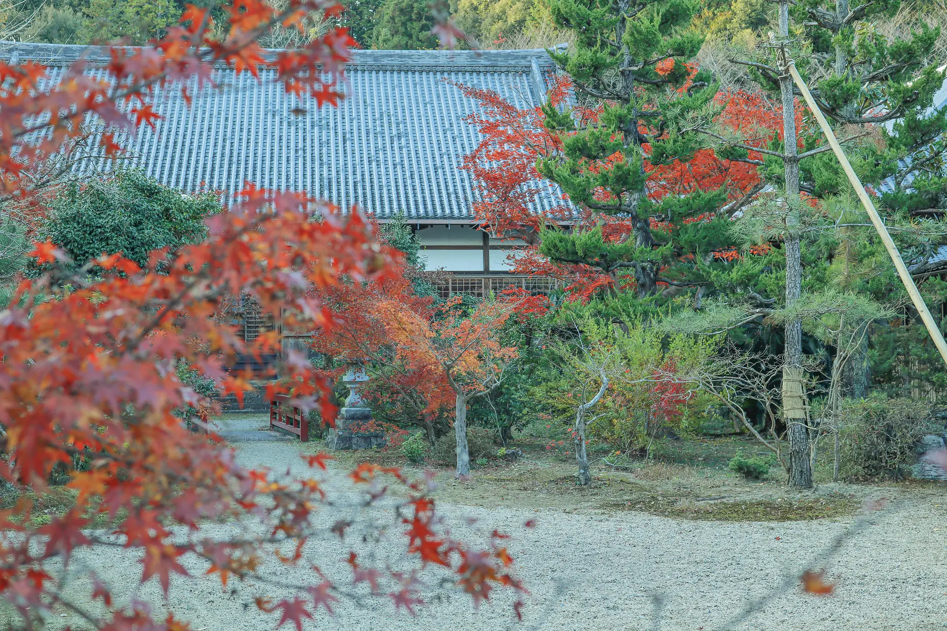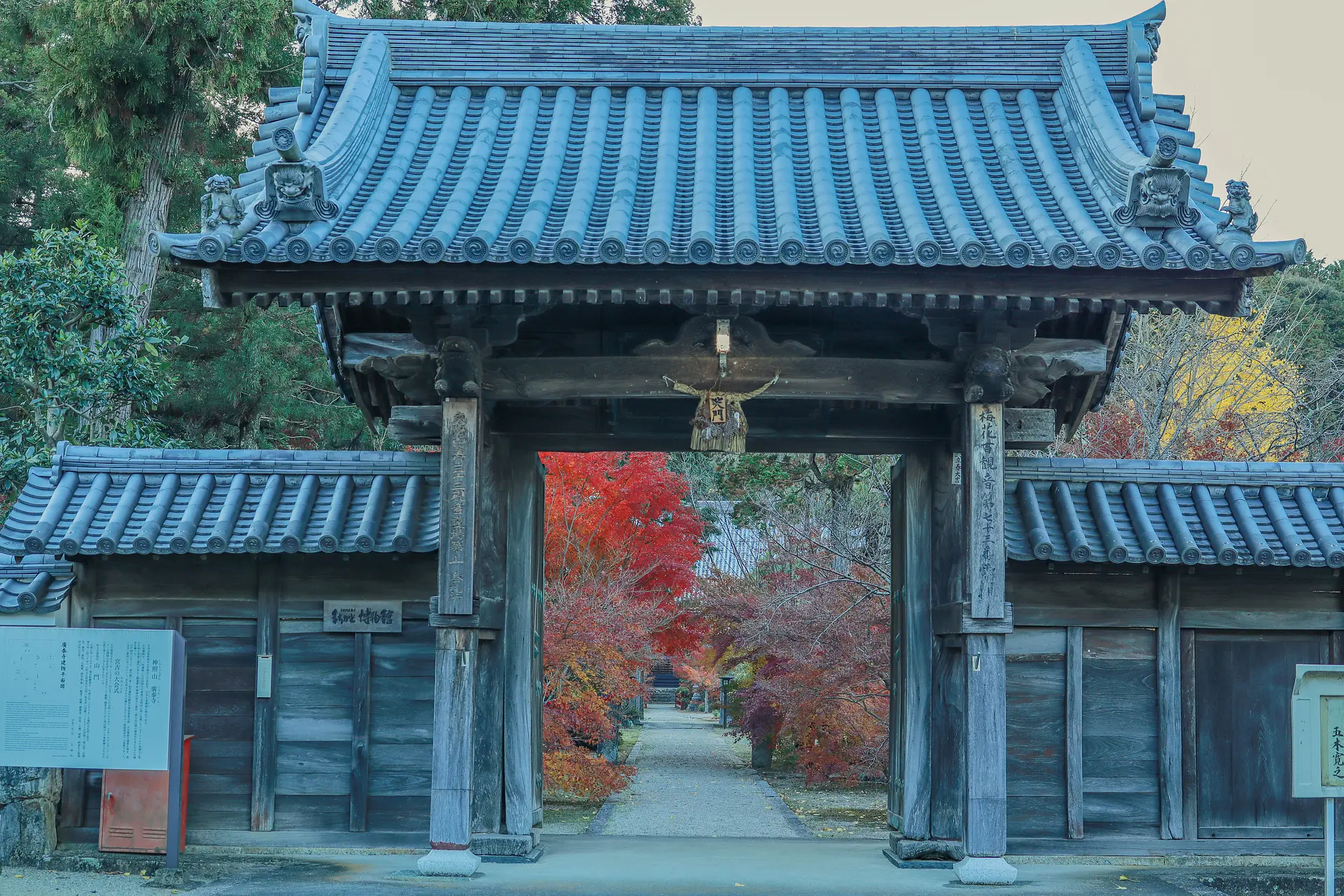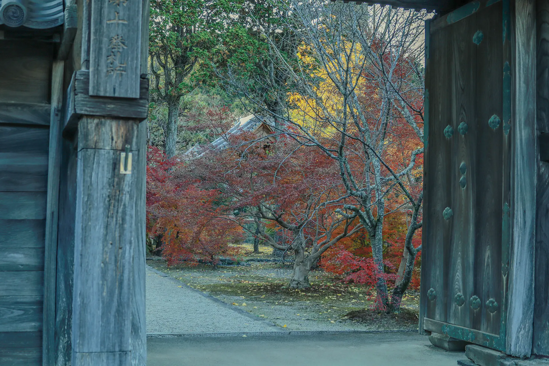 「広泰寺」には町指定文化財の山門があり、奥には赤く色づいた木々が見えます。山門が額縁のようになって風景を切り取っています。境内に入る前からわくわくしますね。