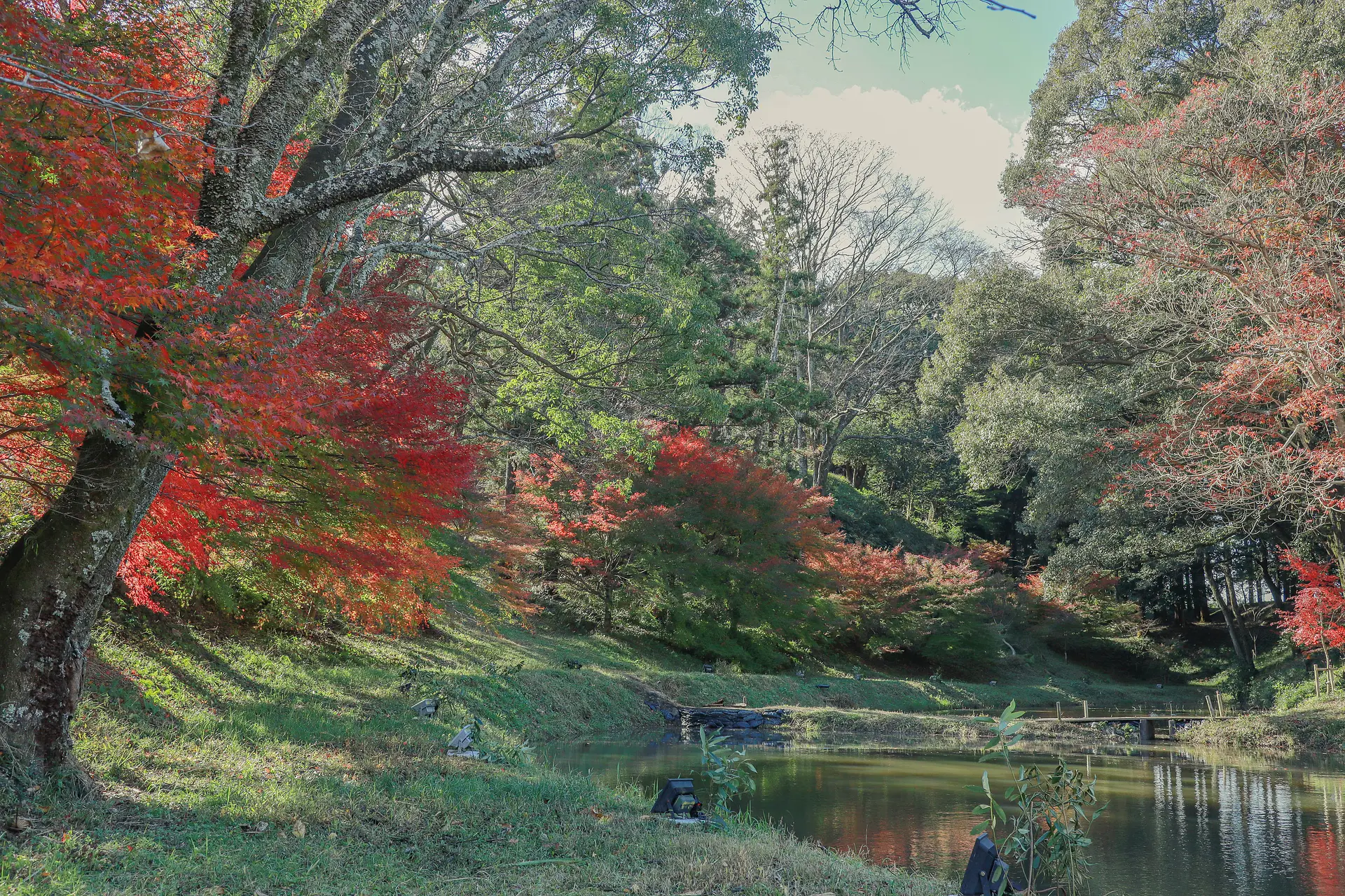石垣とモミジを一緒に観賞できるほか、屋内体育館前のビオトープでは水面に映る紅葉も見られます。