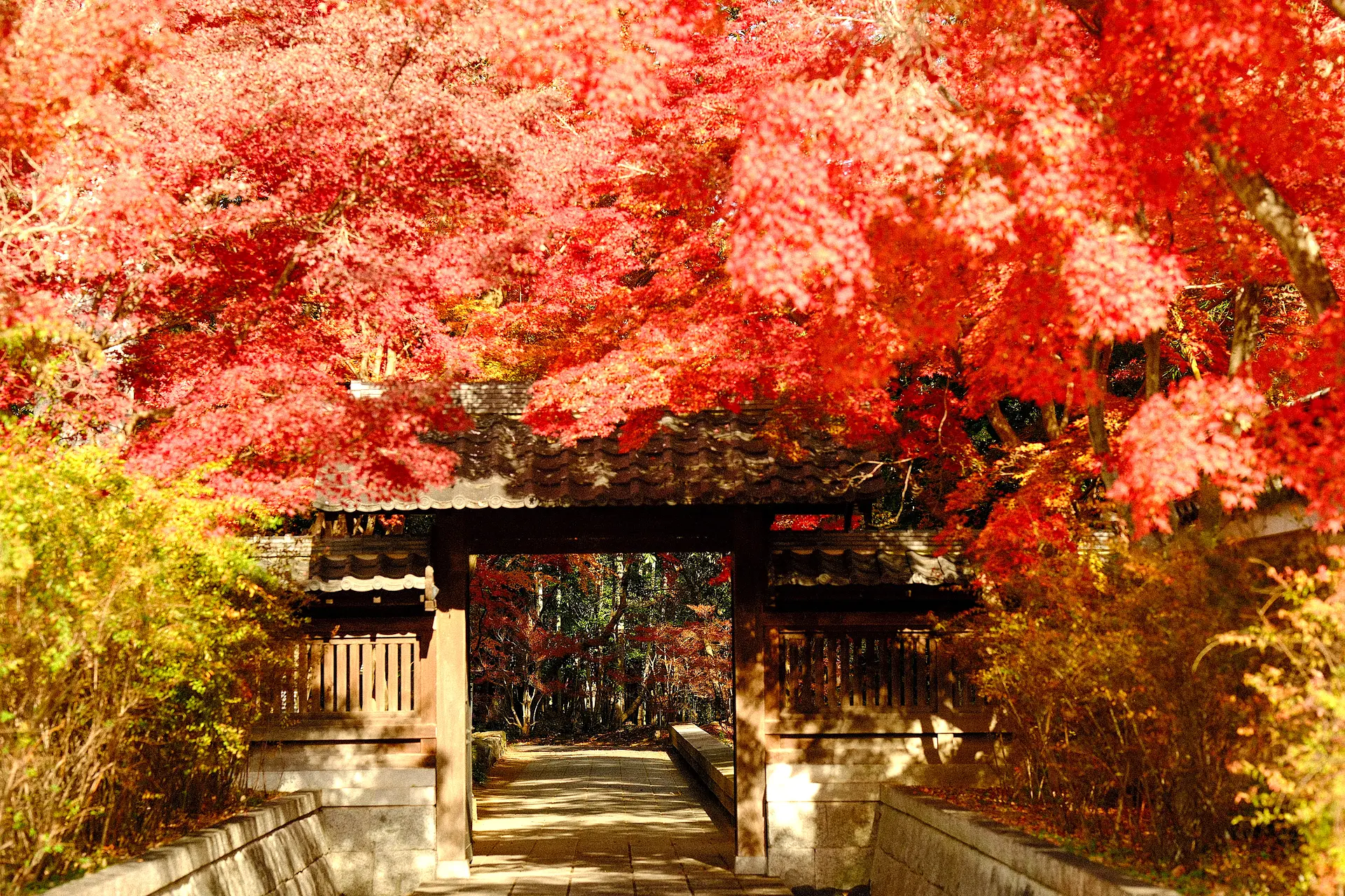 山門を中心にモミジやイチョウなどが色づき、県下ではここだけしかない建造物の国宝である建物との競演が見事です。