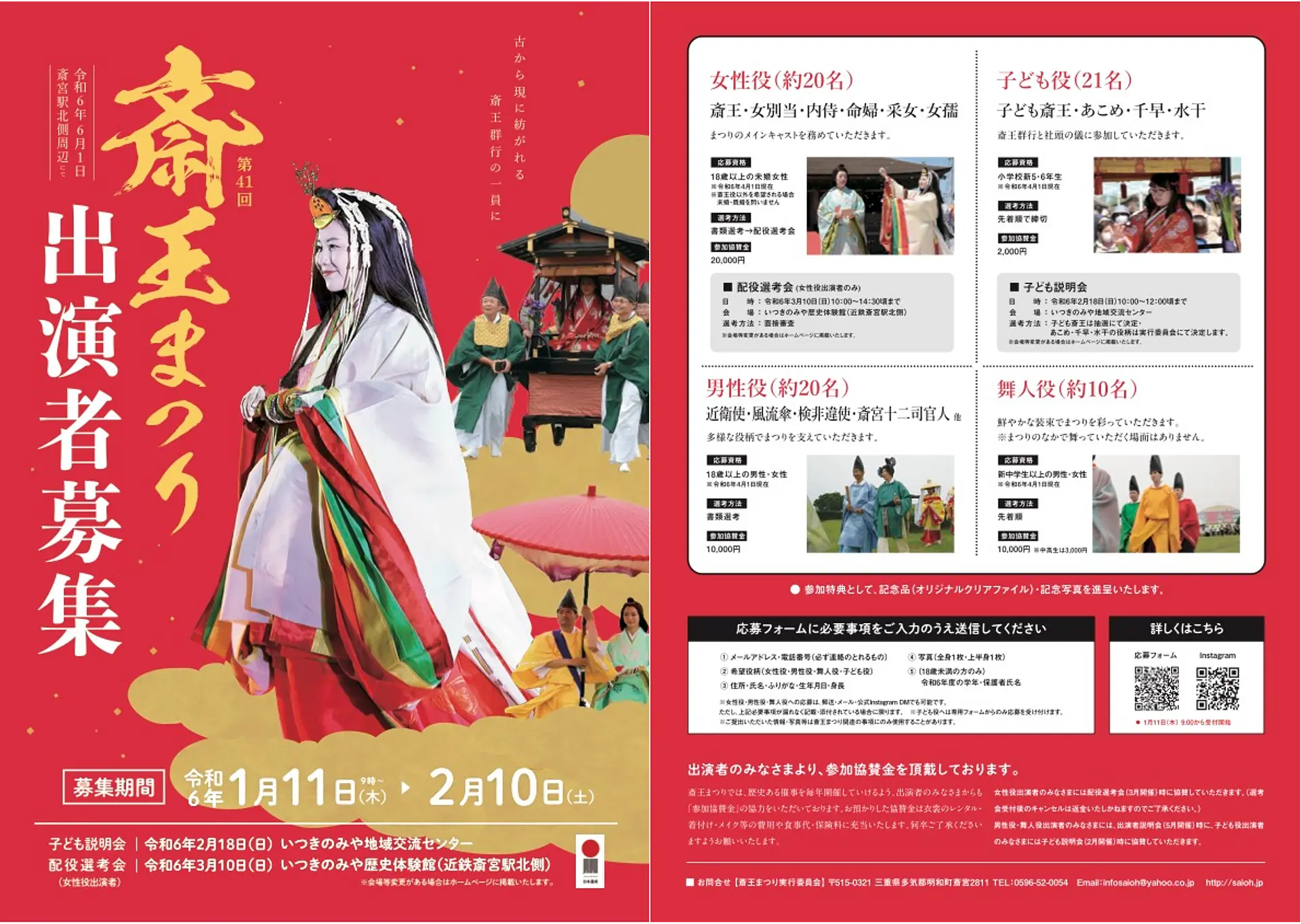 第41回斎王まつりは2024年6月1日(土)に開催が決定し、1月11日午前9時より斎王役をはじめとする斎王群行出演者の募集が開始されます。