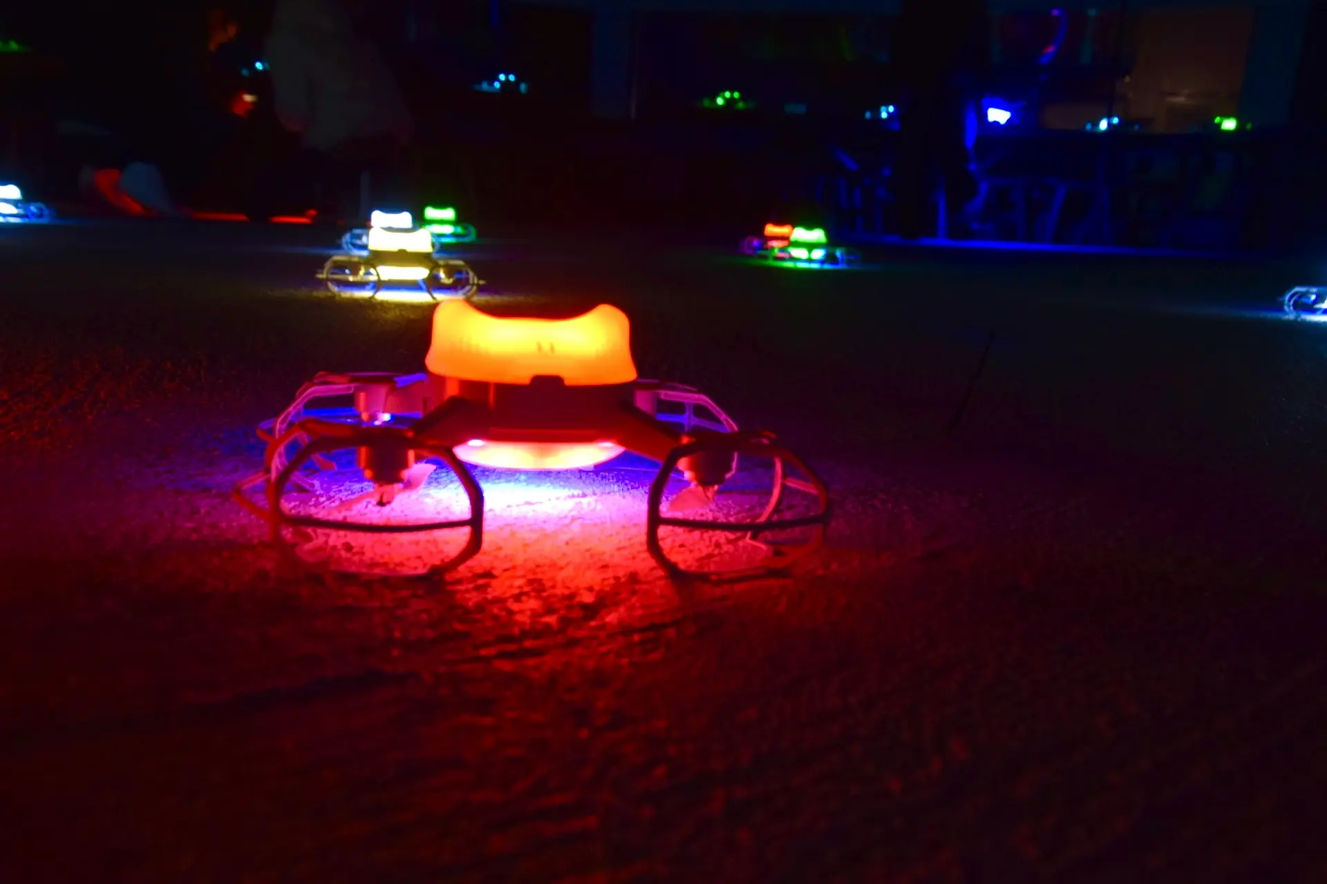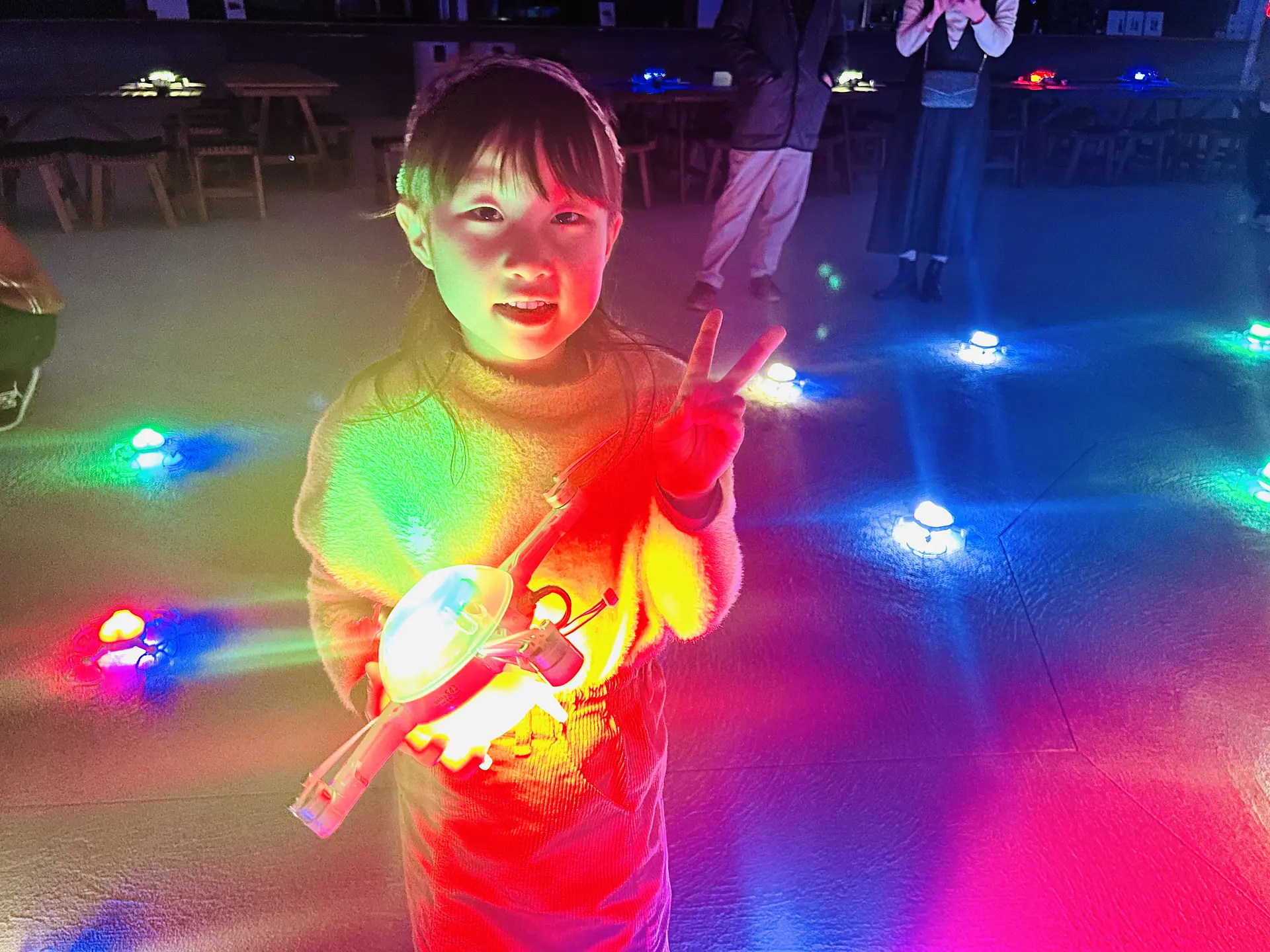 約5分でドローンショーは終了するのですが、そのあとにドローンショーの中心エリアで地面に並ぶカラフルなドローンと記念撮影を自由にすることができます!実際に手にもって写真を撮れたりと、子供達も大喜び♪
