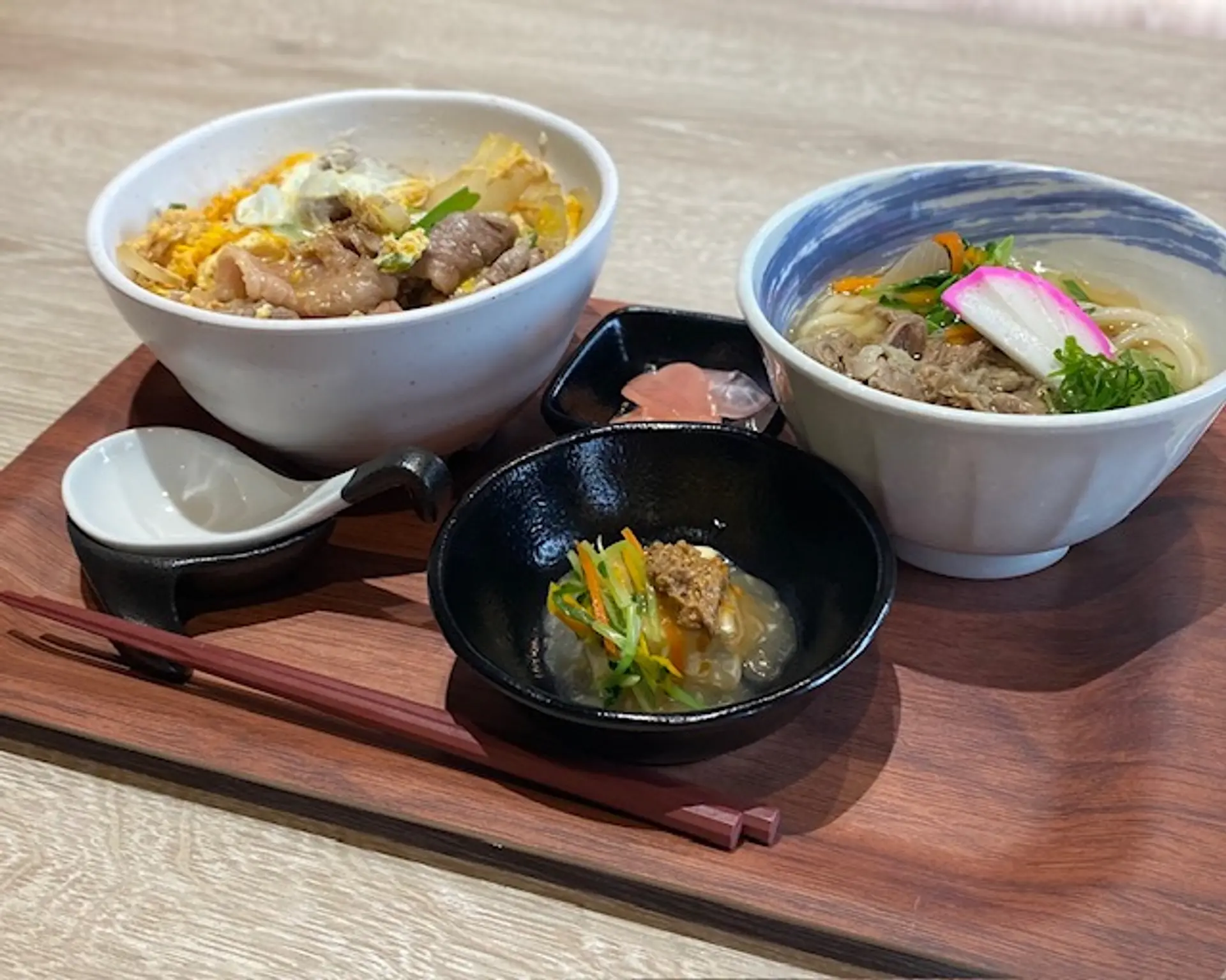そしてこのボリューム感。松阪牛の肉をふんだんに使った肉うどんと牛丼、そして嬉しい小鉢付き。