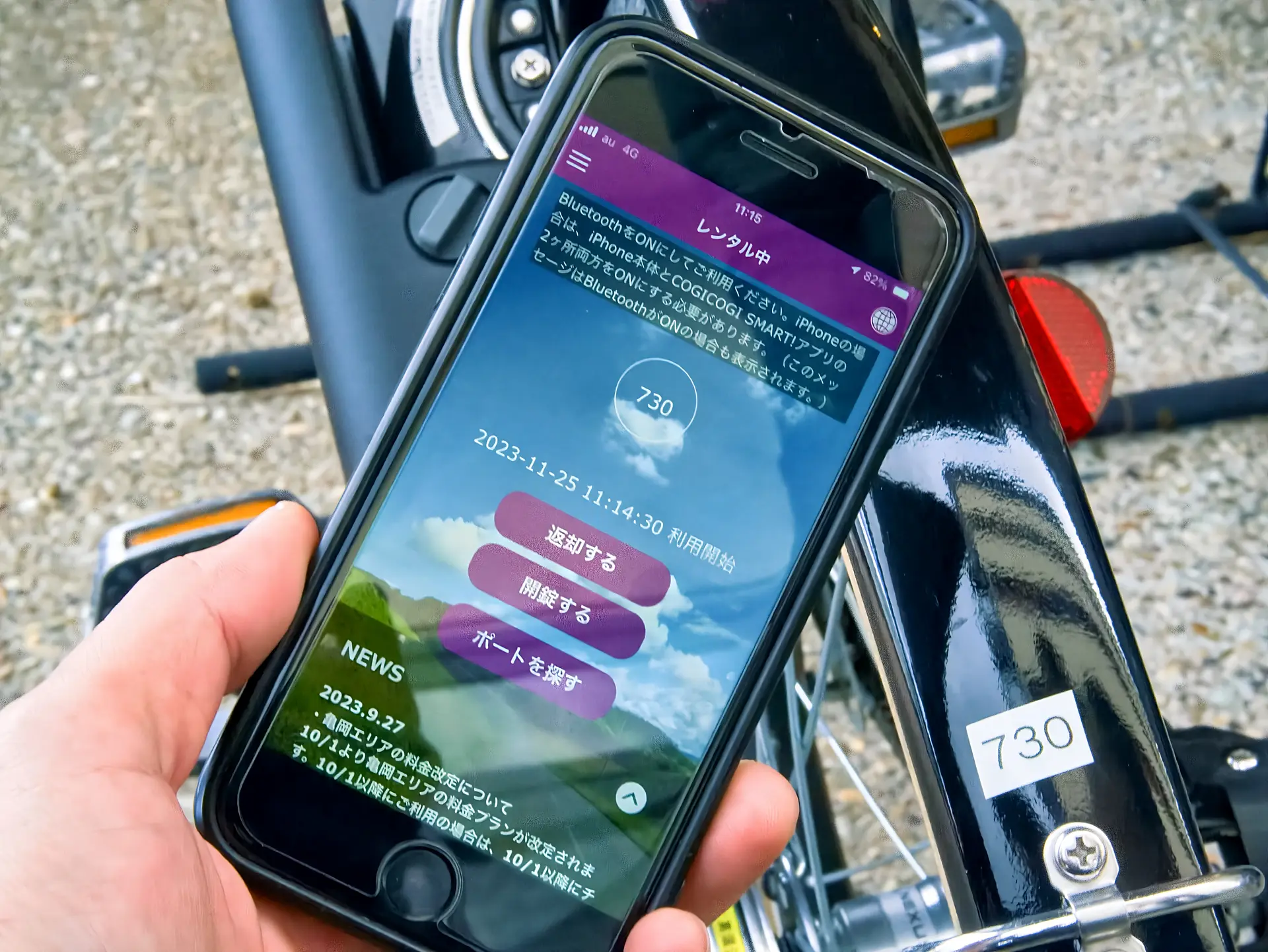 まずアプリをダウンロード。アカウントを作成して(支払いにクレジットカード情報も必要)、スマートフォンのBluetoothと位置情報をオンにします。ポート付近でアプリ内の「借りる」をタップし、自転車の車体番号を入力すれば利用できます。