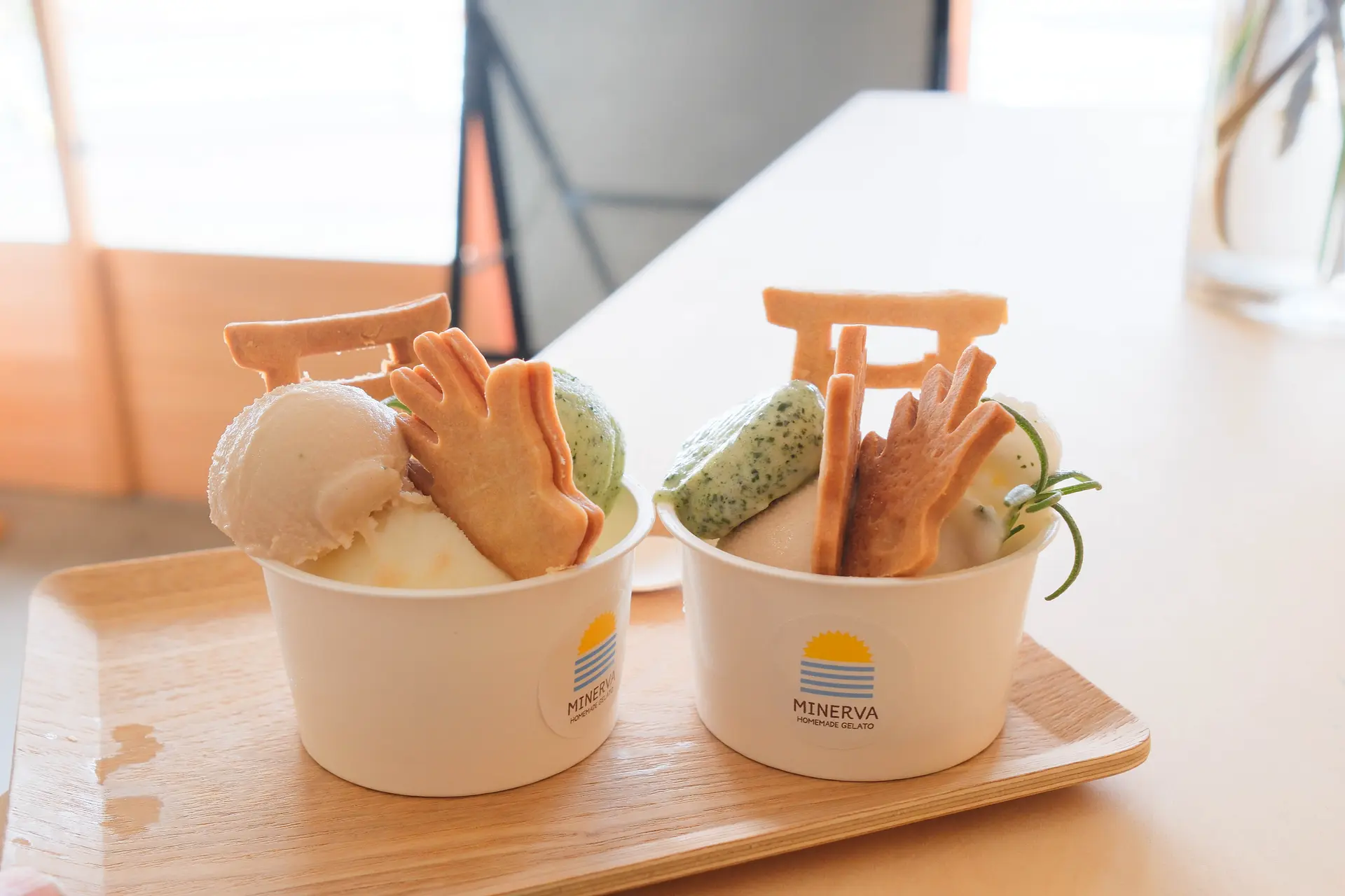 鳥居と柏手をかたどったクッキーがお伊勢参りを盛り立ててくれる「萬金ジェラード」。伊勢神宮内宮近くの伊勢くすり本舗に併設されたカフェコーナーでは、和漢植物など10種配合した「萬金コーラ」や、ジェラート( 萬金/岩戸の塩/伊勢茶 )がいただけます。