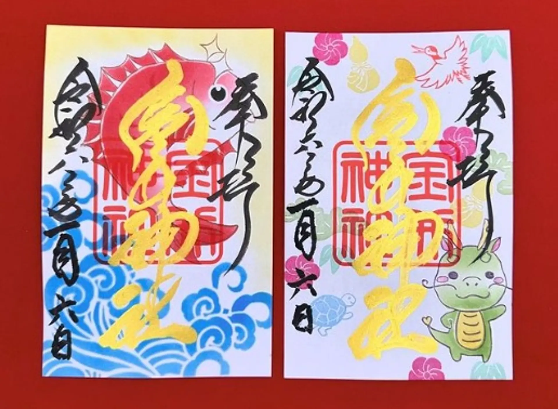 1月の月替御朱印のテーマは「松竹梅」と「めで鯛」。松竹梅の可愛らしい文様に、鶴や亀、干支である辰がデザインされた御朱印と、勇ましく波から跳ね上がる真っ赤な鯛がデザインされた御朱印が登場。