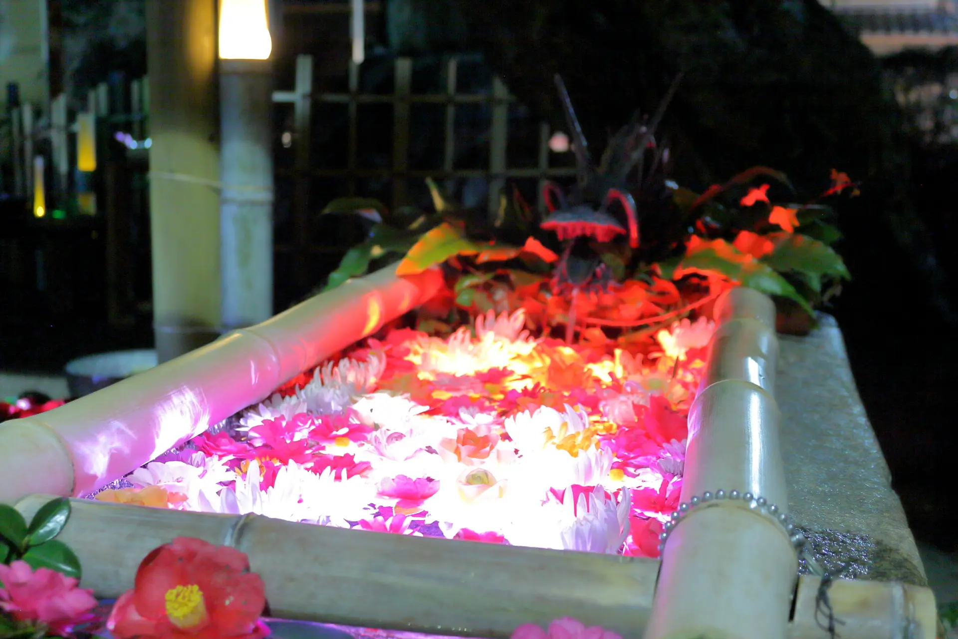 花手水が綺麗で、満月の夜にはライトアップもあります(満月参り)。