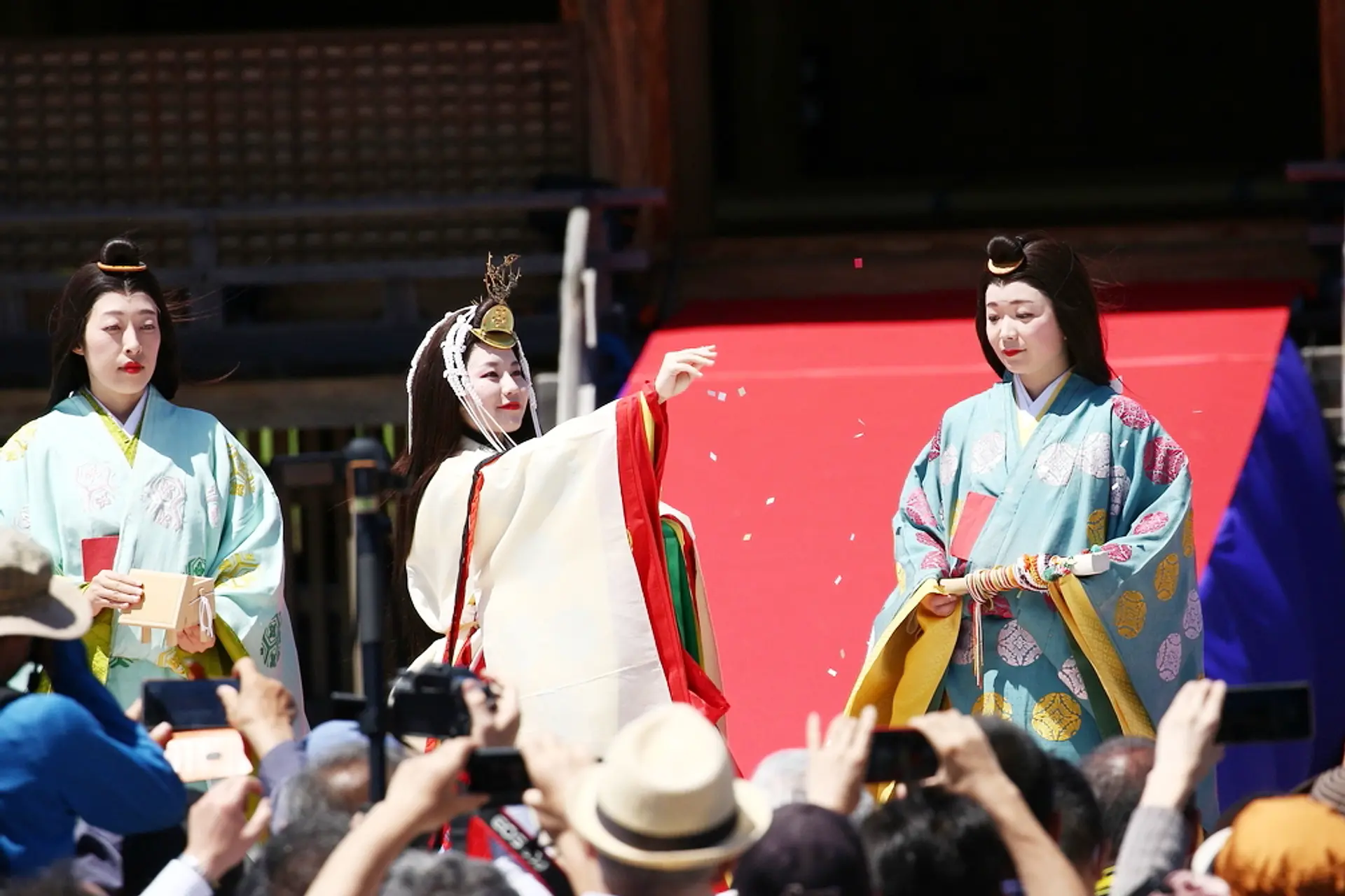 斎王まつりのメインは斎王が京の都から伊勢(斎宮)へと群行された様子を再現した「出発式(禊の儀・発遣の儀)、斎王群行、社頭の儀」で、平安時代の王朝絵巻を彷彿とさせる様子は目を見張るものがあります。