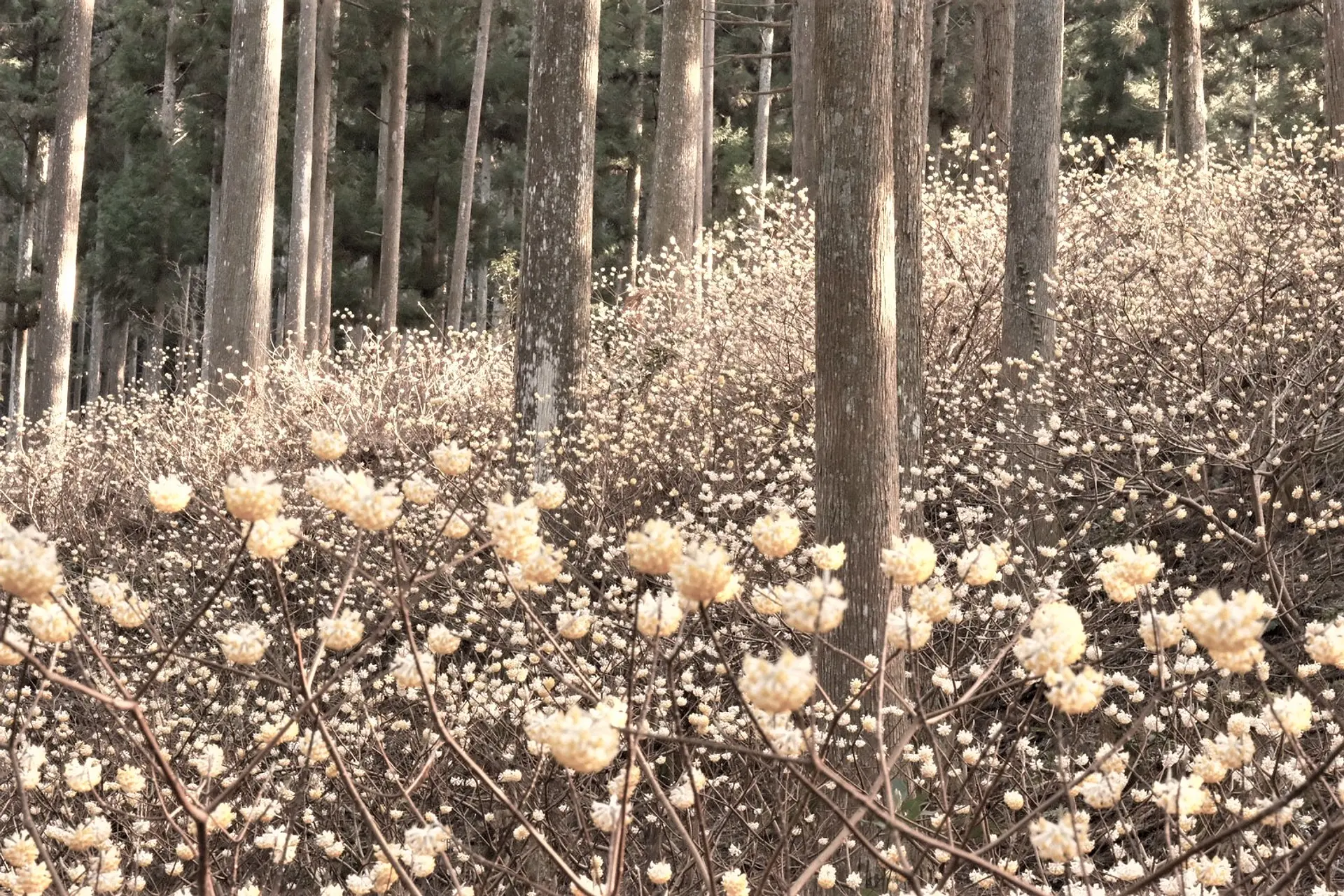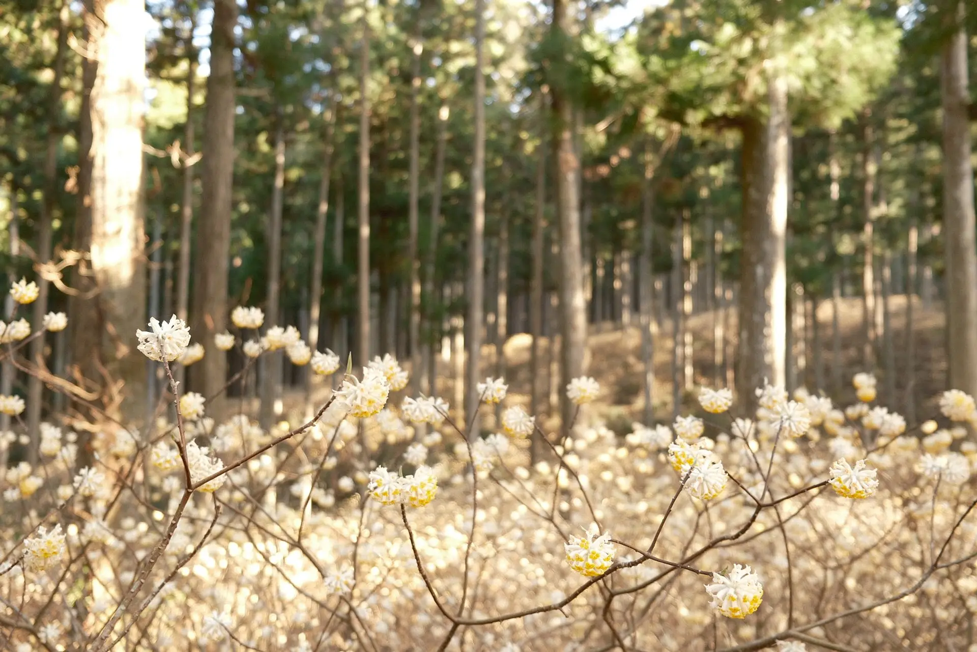 ミツマタの花は前半に黄金色の花を咲かせ、黄色い花弁が落ちた後半には白銀へと衣替えし、より幻想的な風景を見せてくれます。「黄金のミツマタ」と「白銀のミツマタ」と、二度楽しむことができるミツマタの花。