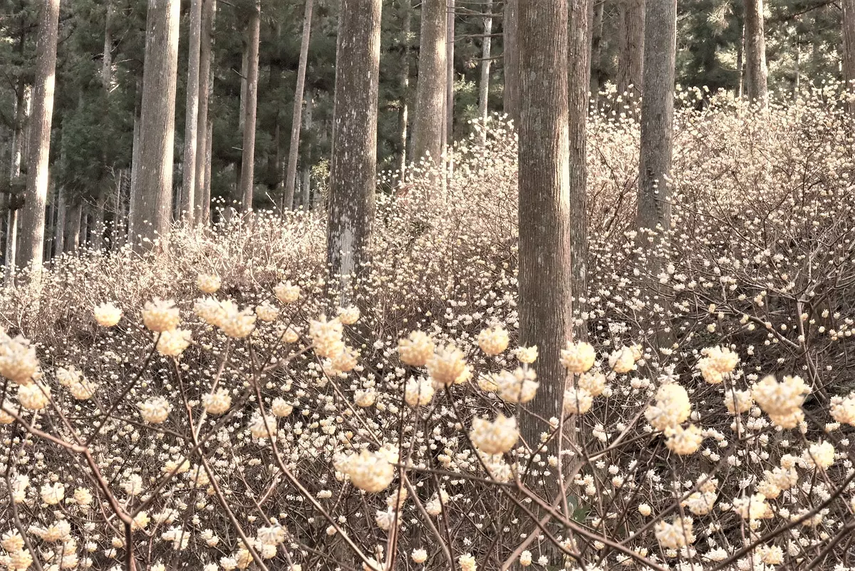 三重県津市美杉町のミツマタ群生地は、春の訪れを告げる「ミツマタの花」の名所。