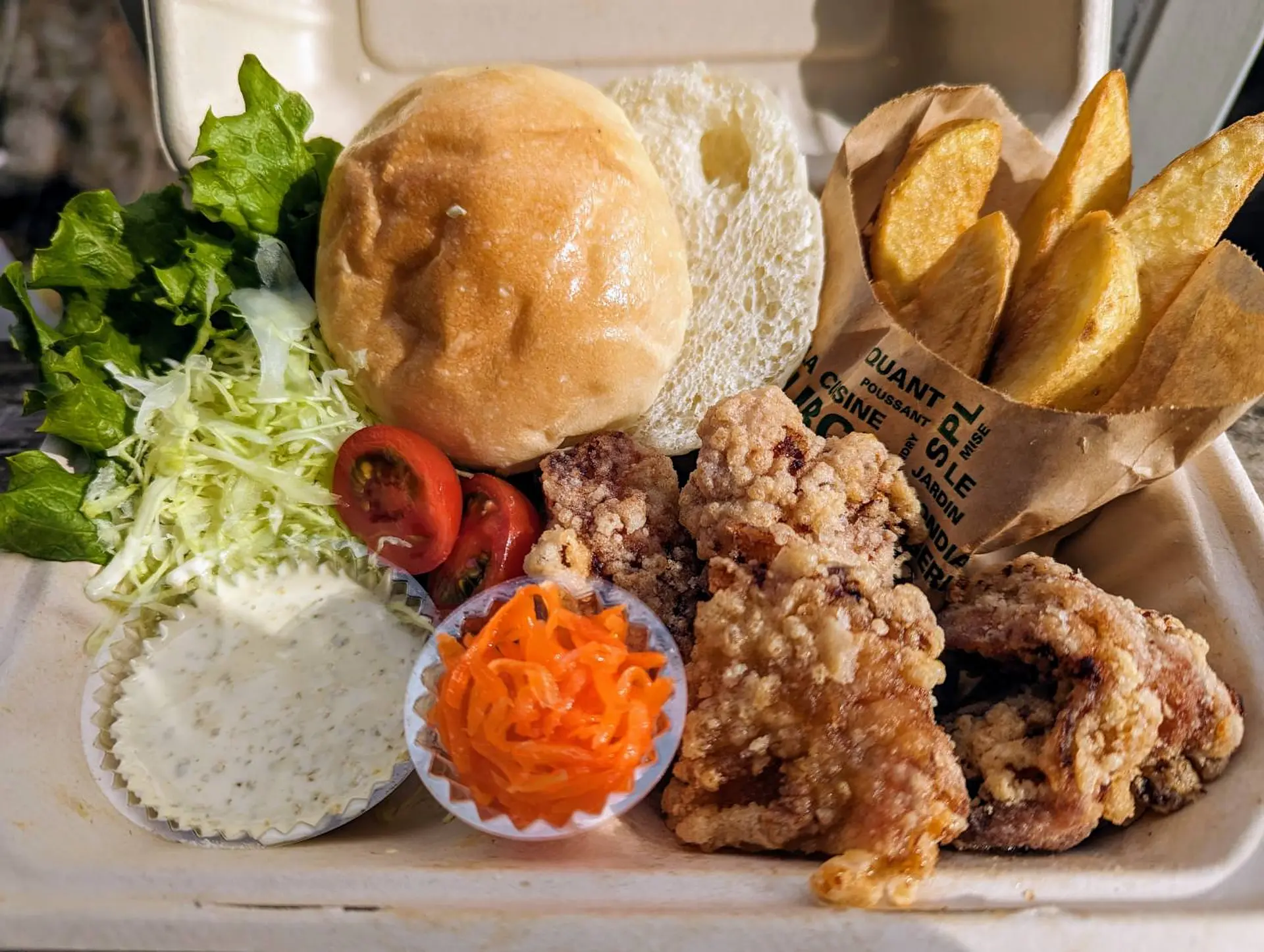 大きな唐揚げ、ハンバーガーに合う人参のラペ、ポテトとボリューム満点です。