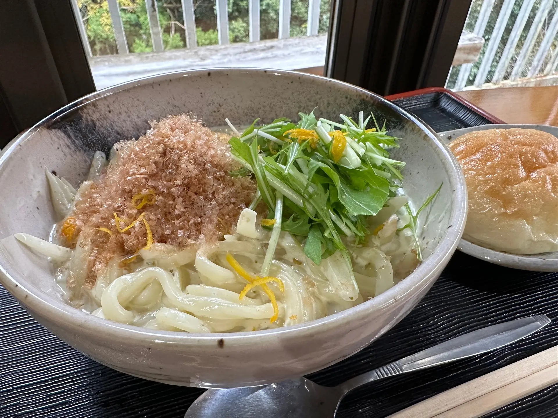 パスタではなく、あたたかいうどんにピリリと辛い自家製柚子こしょうと生クリームのソースが絡みます。ベーコンにかつお節と、和洋折衷が絶妙にマッチした新しいメニュー。
