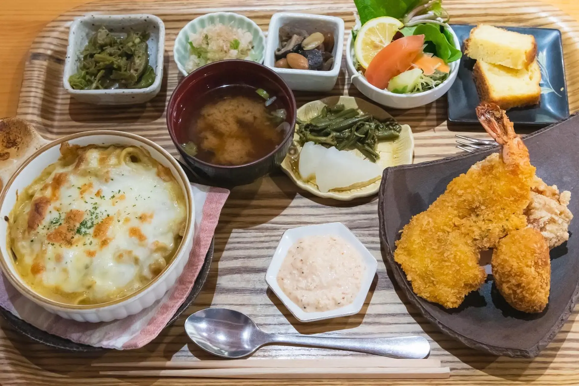 自家製柚子こしょう付きの卵かけご飯かカレードリア(チキンカレーかグリーンカレー)どちらかを選択し、揚げ物、小鉢3種、サラダ、漬物、デザートが付いてきてお腹いっぱいになります!
