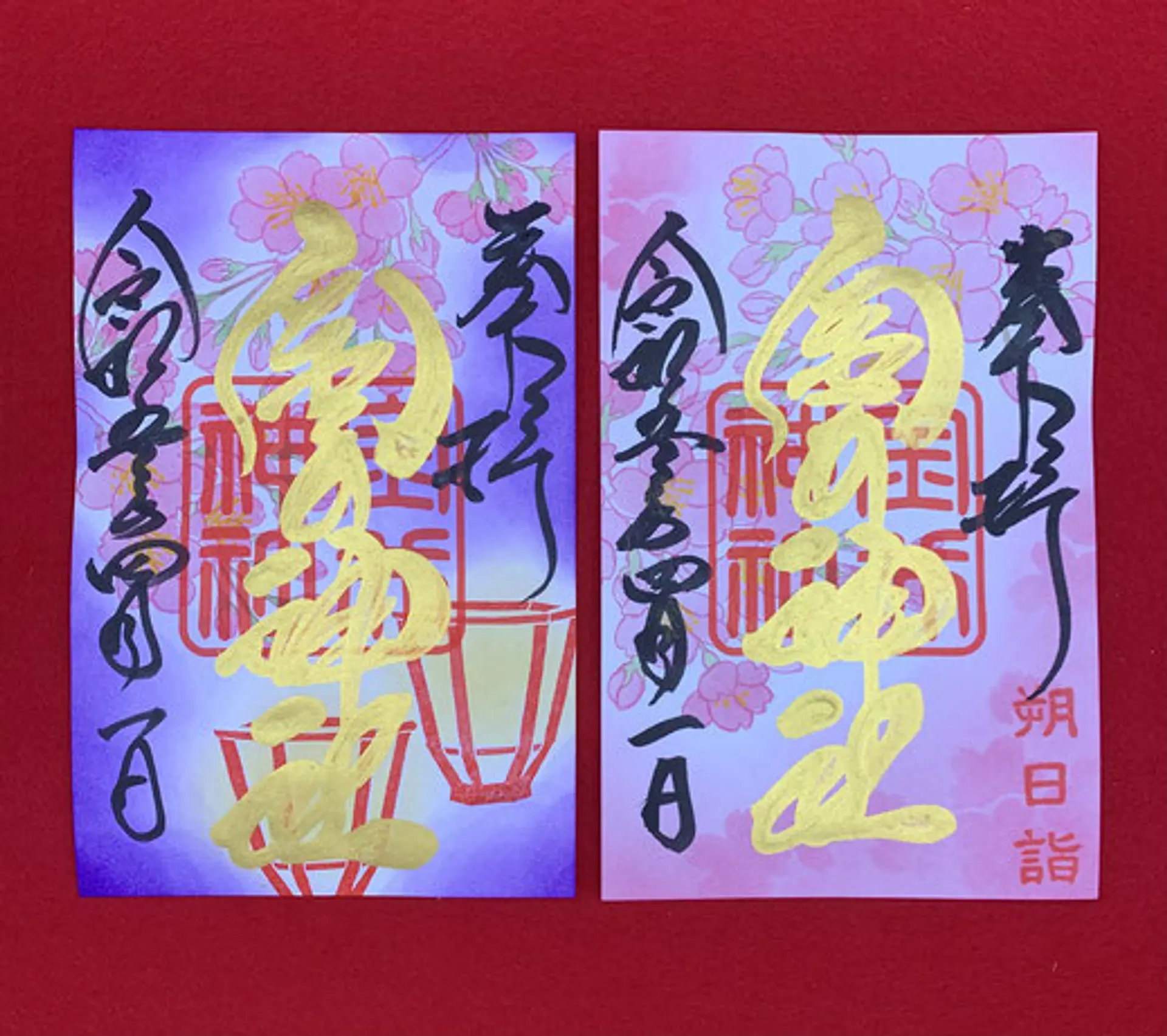 さくらの地模様の上に金色の文字で書き入れられた御朱印は2種。夜桜バージョンはぼんぼりが描かれ、ほんのりブルーの色合いは趣があります。
