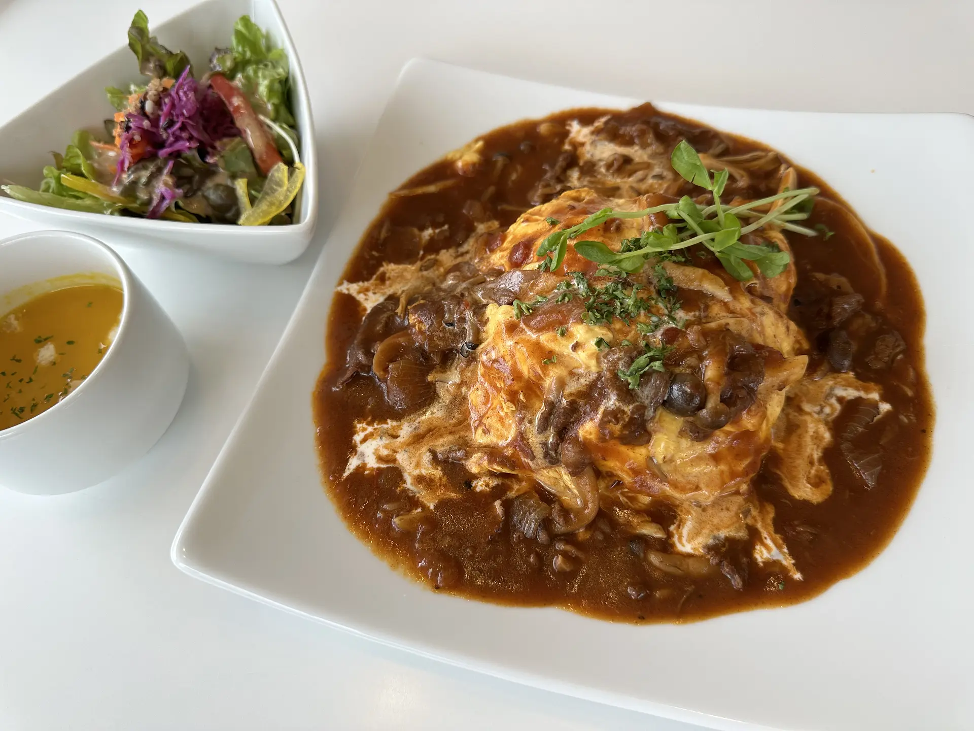 明和店は、ハッシュドビーフのオムライス。国産牛肉と大きめに切った玉ねぎをじっくりと煮込んだキノコたっぷりのハッシュドビーフソースが、ふわふわ卵のオムライスの上にかかっています。こちらもサラダとスープ付き。