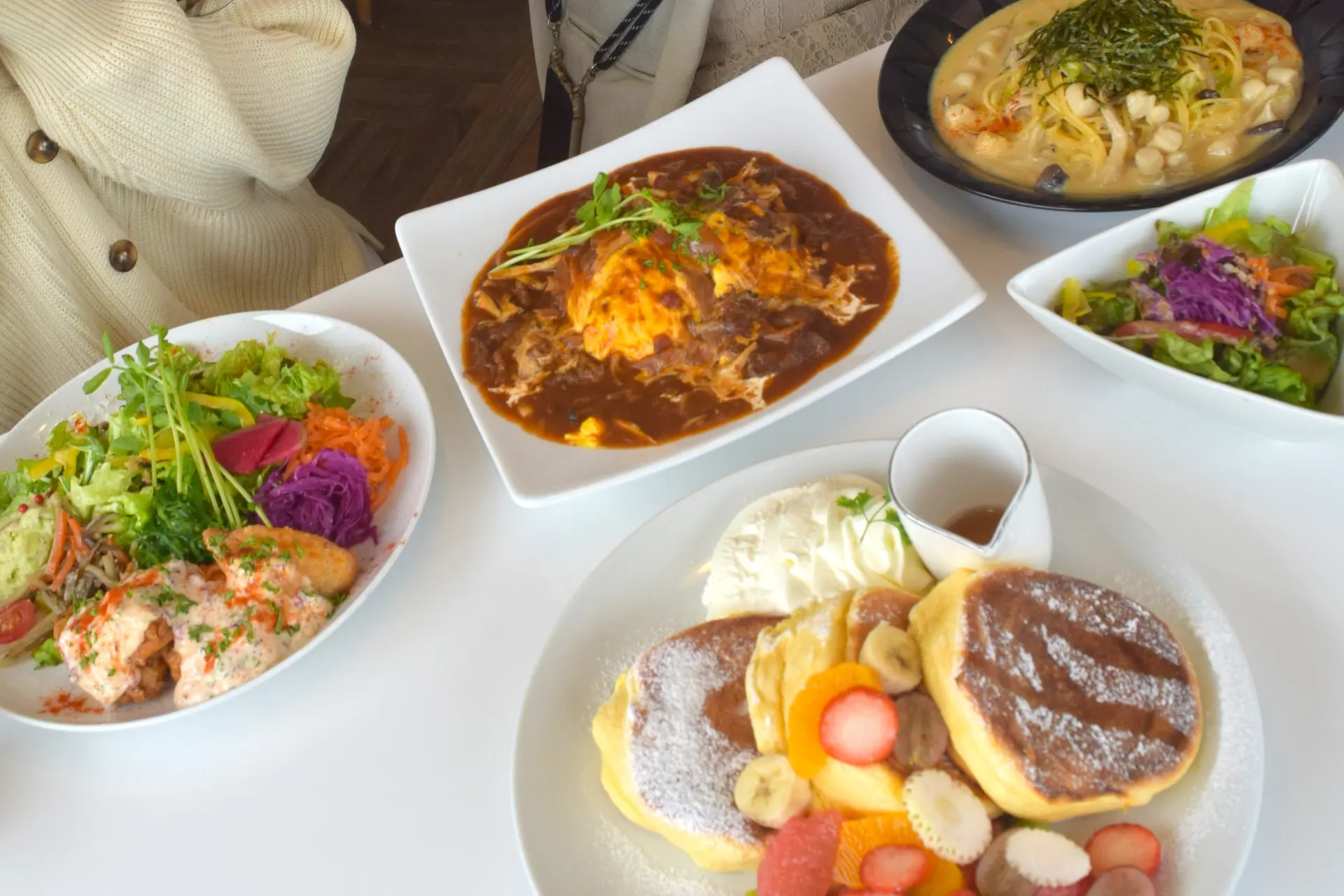 充実のフードメニューに「天使の羽セット」を付けてパンケーキ1枚を楽しむもよし、仲間や家族と充実のパンケーキをシェアするもよし。