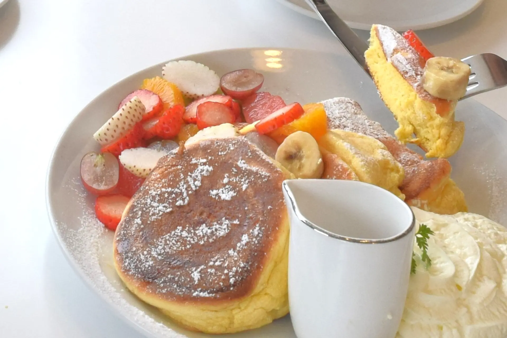 写真は、明和店限定の「季節のフルーツパンケーキ」。旬のフルーツをたっぷりとあしらった大きくて贅沢なパンケーキに、ふんわりと軽いエスプーマホイップをつけながら食べ進めます。