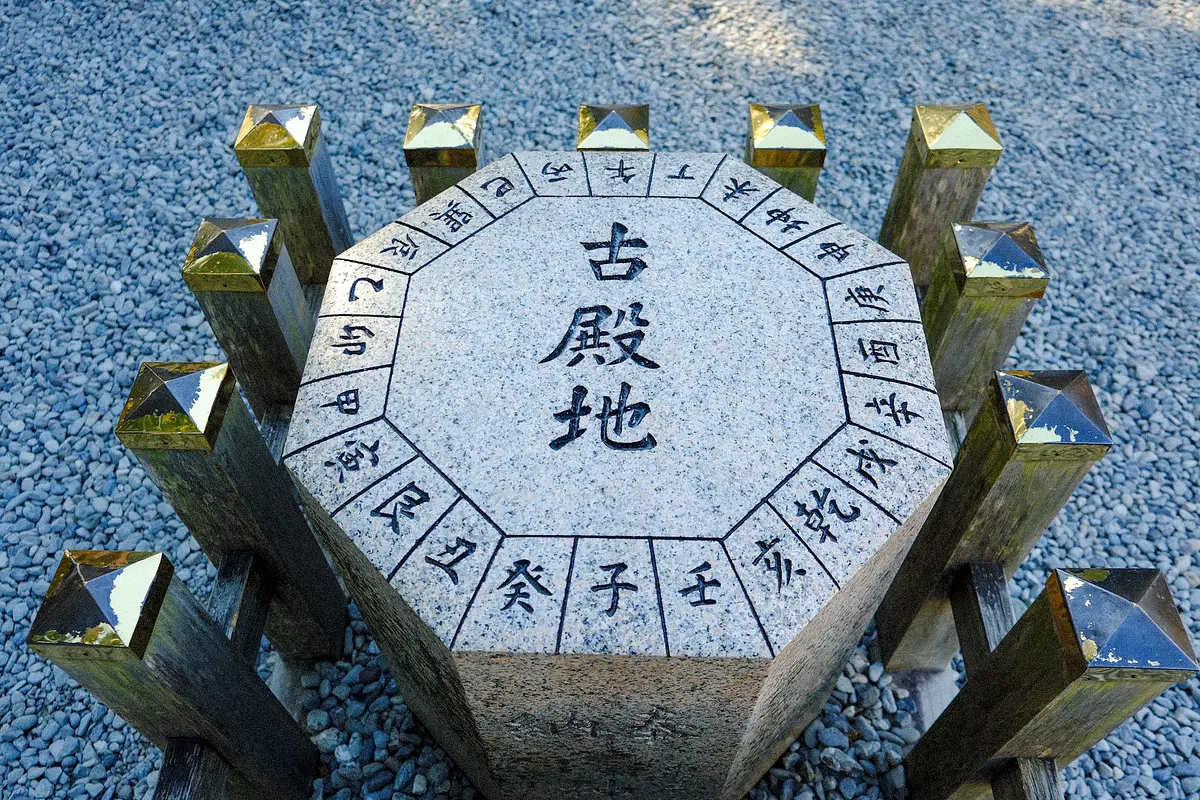 猿田彦神社境内の真ん中には、方角や干支が刻まれた八角の石柱が。