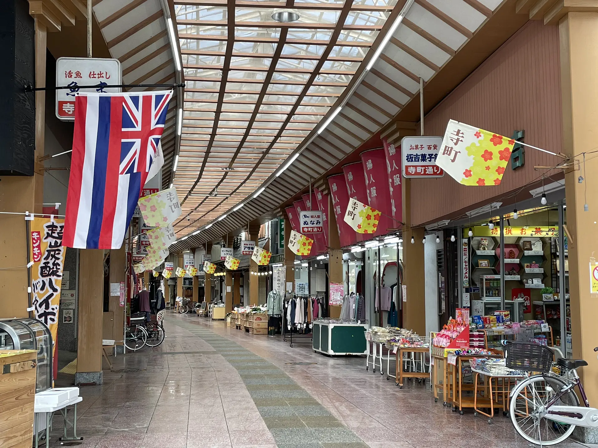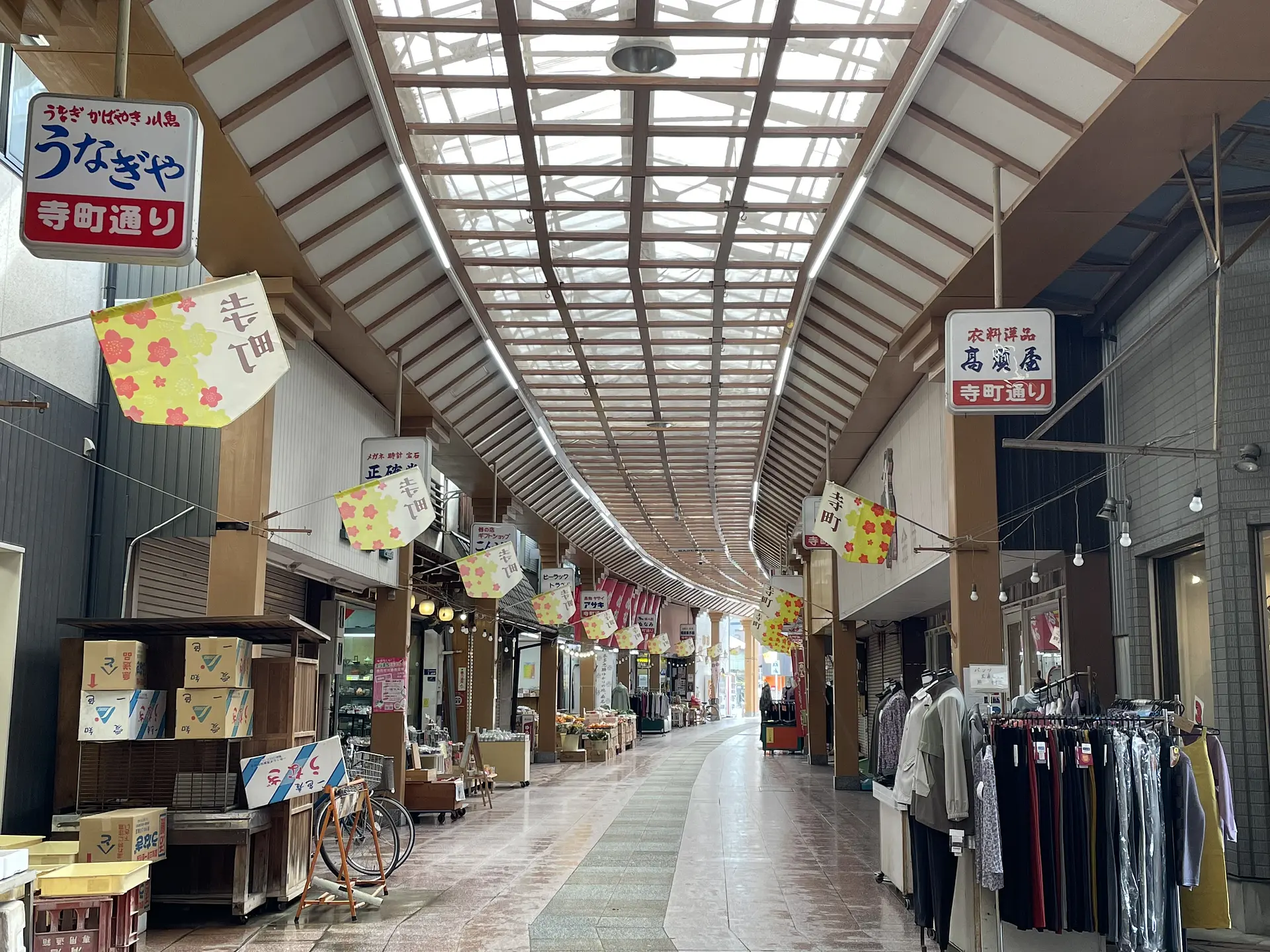 寺町通り商店街はアーケードのある大きな商店街。和菓子屋や飲食店、惣菜屋、衣料品のお店など、レトロな雰囲気のお店や新しいお店などが軒を連ねています。