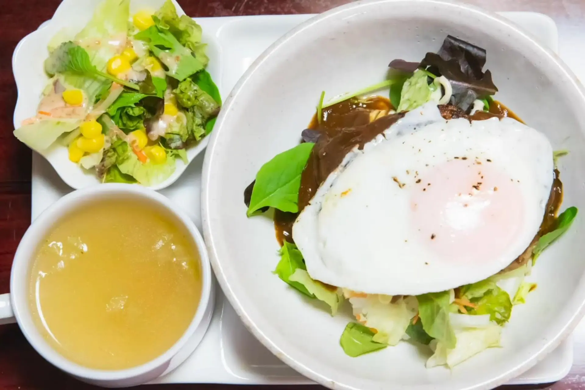 11時~14時までのランチタイムには、お食事パンケーキのプレートとご飯もののカフェ飯。すべてのランチにサラダとスープが付いてきます。