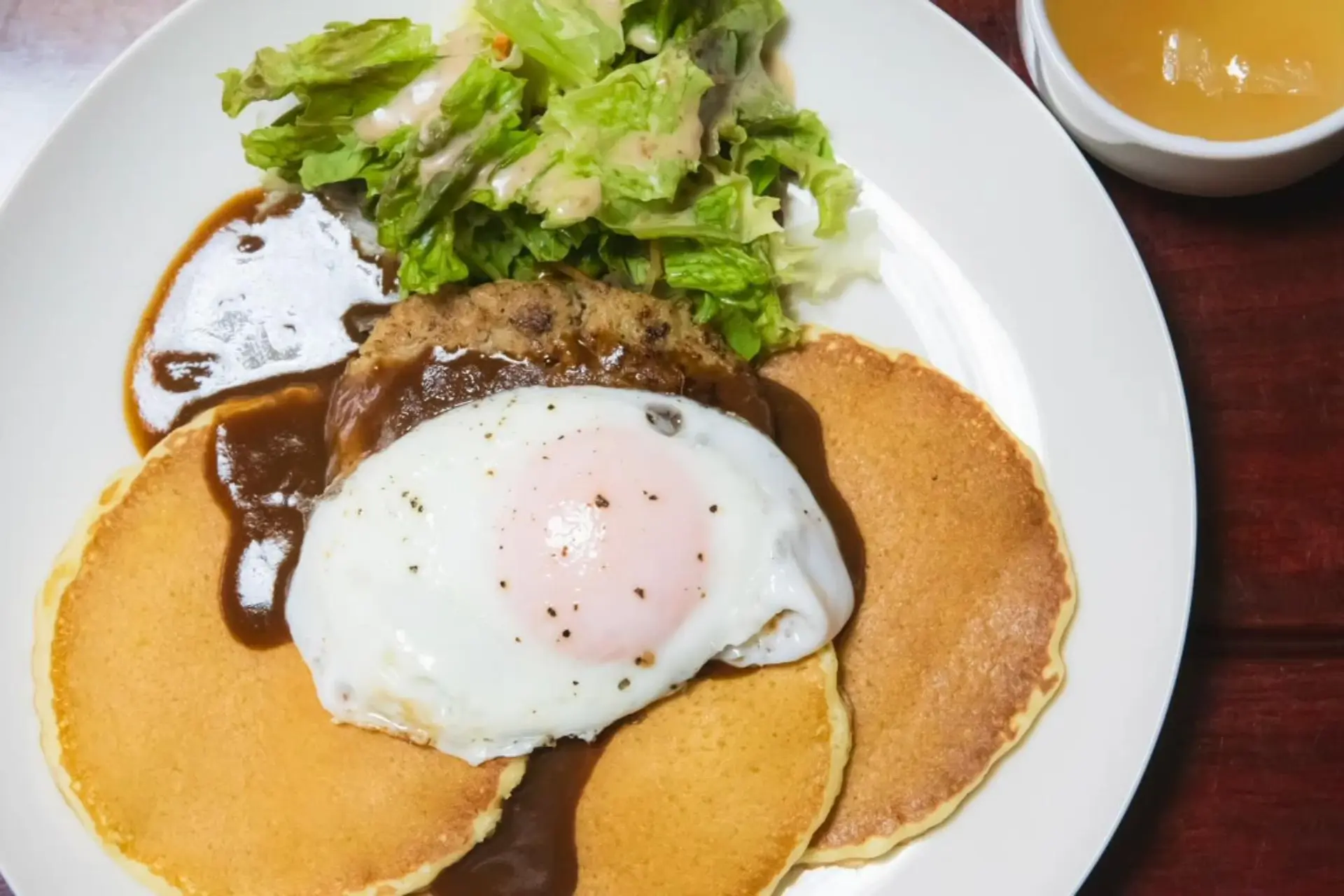 写真はパンケーキプレートから、「パンケーキ ロコモコ」。ジューシーでとろけるほど柔らかいハンバーグに半熟の目玉焼き、自家製デミグラスベースのソースをパンケーキにからめていただきます。