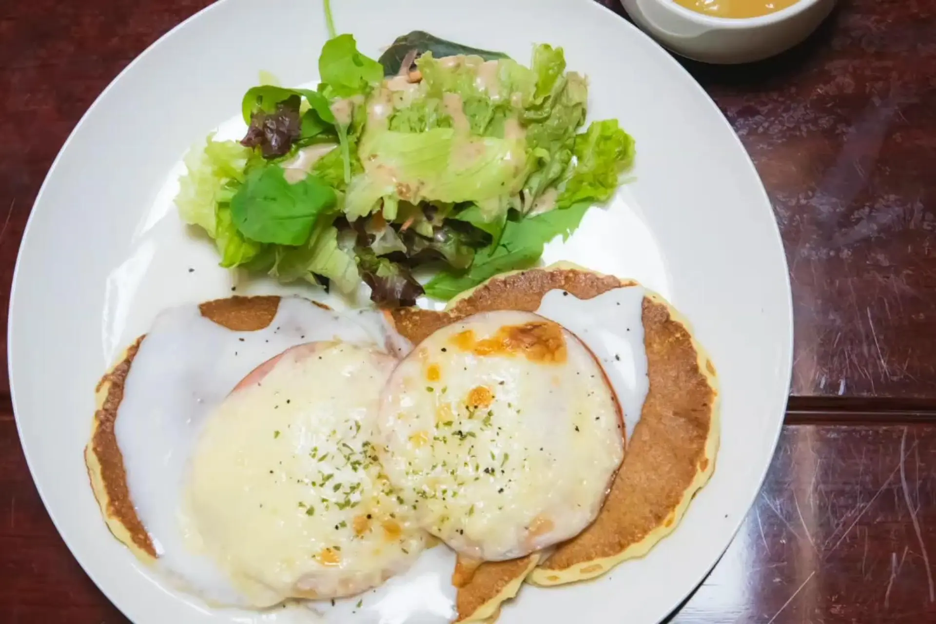 とろ~りホワイトソースにハムの塩気、こんがりとろけたチーズの組み合わせが、もっちりしっとりパンケーキによく合います。チーズ好きにはたまらない!