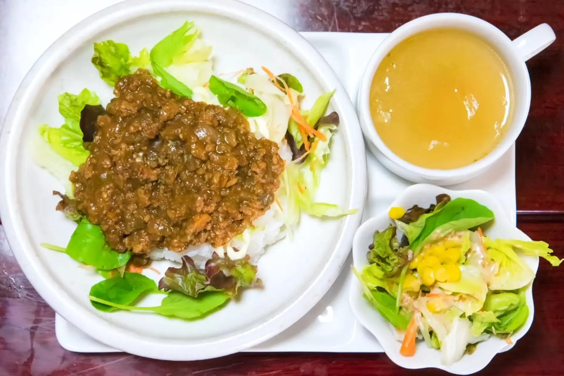 キーマカレーから、写真は「サラダキーマカレー」。ピリッと辛いキーマカレーに、フレッシュなサラダをたっぷりと。ほかに、チーズキーマカレー、目玉焼きキーマカレーがあります。