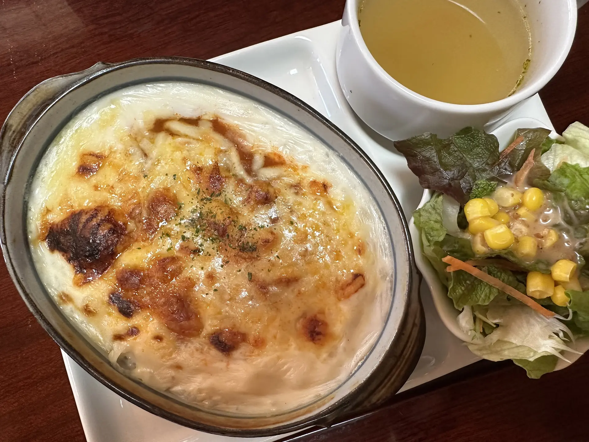 肌寒い季節の人気メニュー「ミラノ風ドリア」。ミートソースとホワイトソース、こんがりチーズがおいしい飽きのこない一品。