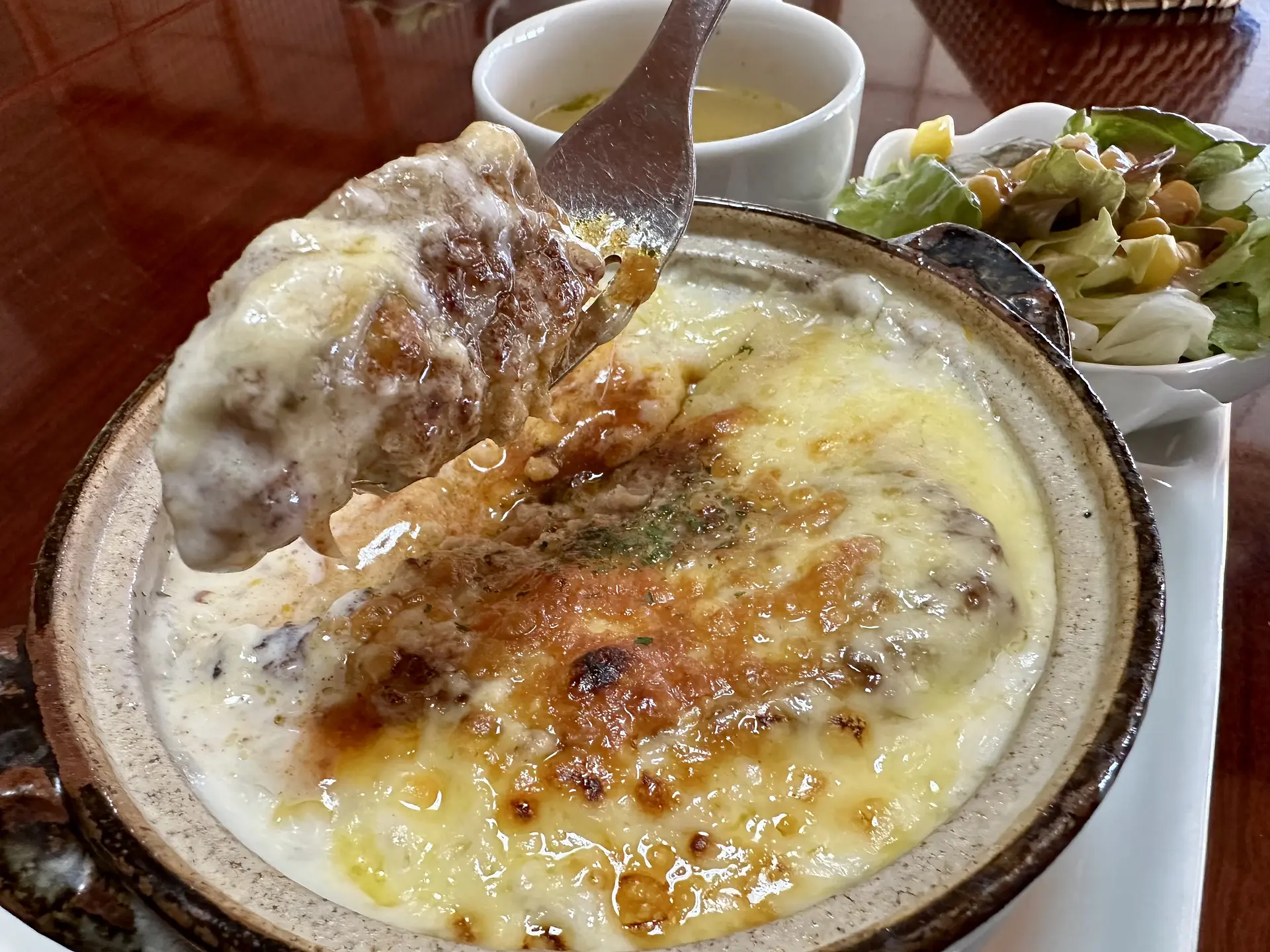 ミラノ風ドリアにcafe.muku自慢の自家製ハンバーグを乗せた満足感の高いドリア。スプーンを入れると、アツアツの肉汁があふれ出します。体の芯から温まりますよ。