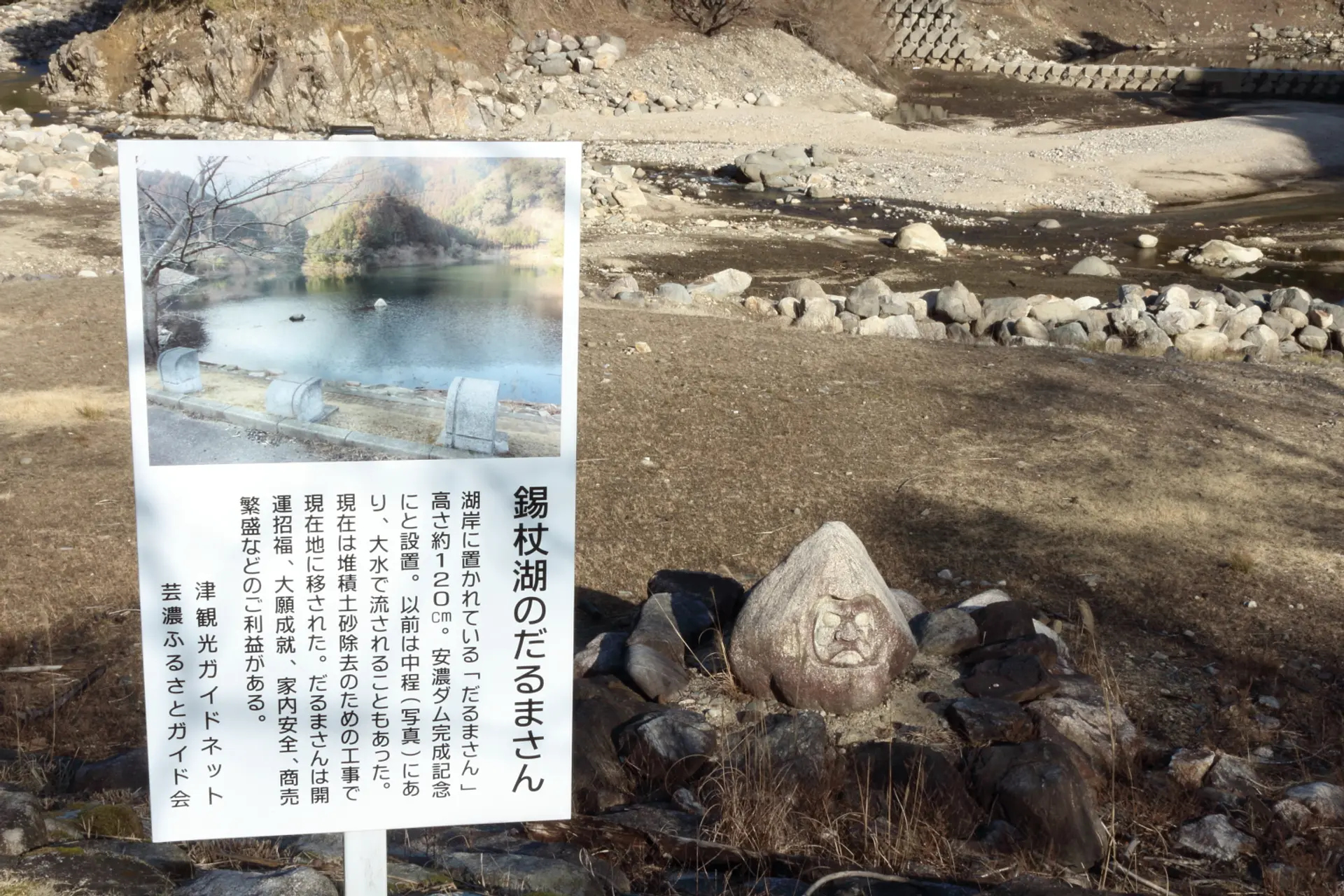 安濃ダムが完成した際に設置された「錫杖湖のだるまさん」といわれる石だるま。一般的にだるまさんには開運招福、商売繁盛などのご利益があるといわれています。現在は、少し湖畔側に移動されているとのことですが、水位が下ると現れるので、錫杖湖を訪れた際は、だるまさんがいらっしゃるか覗いてみてはいかがでしょうか。