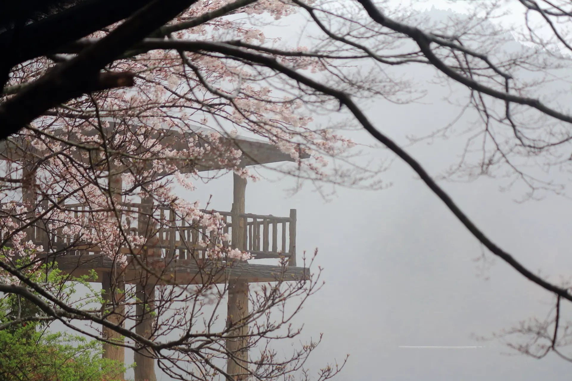 錫杖湖には景色を眺望できる東屋が幾つかあります。こちらの駐車場付近の桜が綺麗で、東屋と桜も風情がありますね。