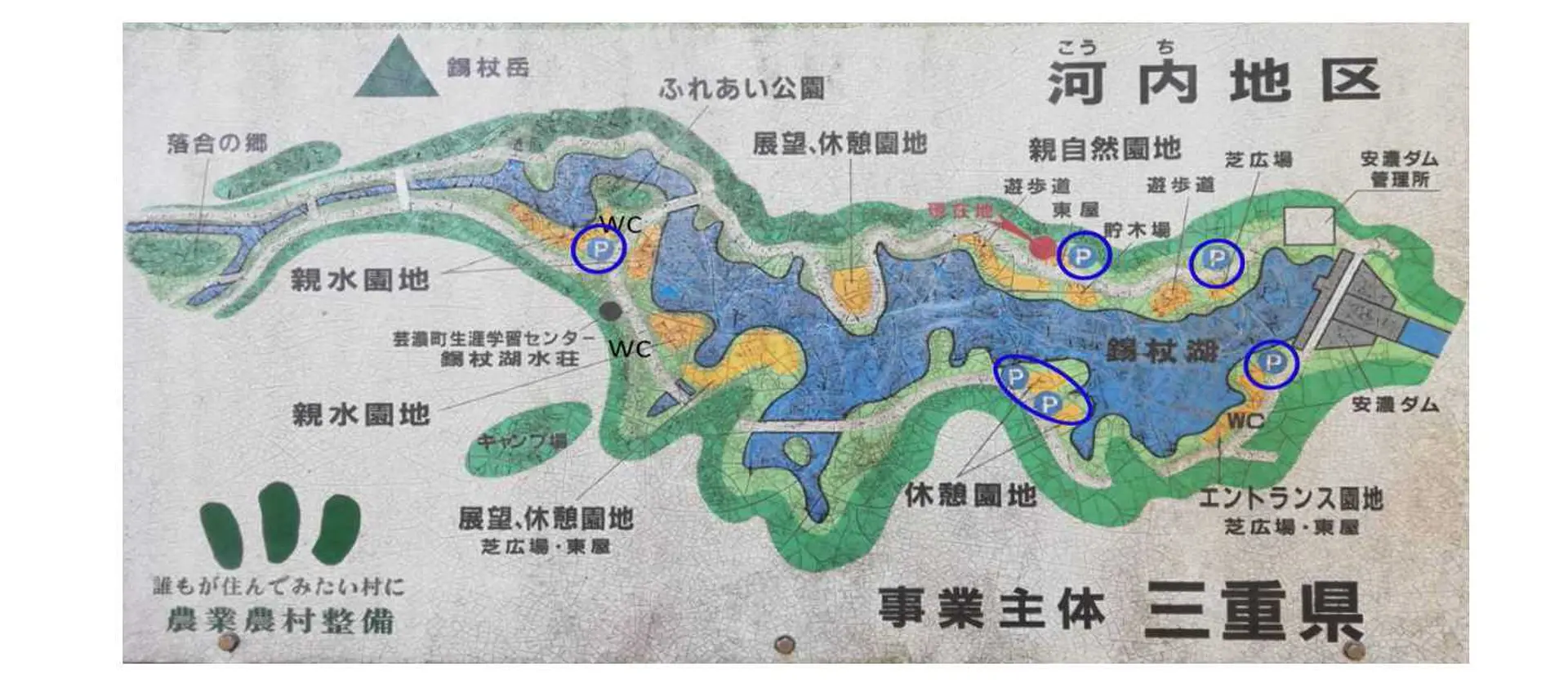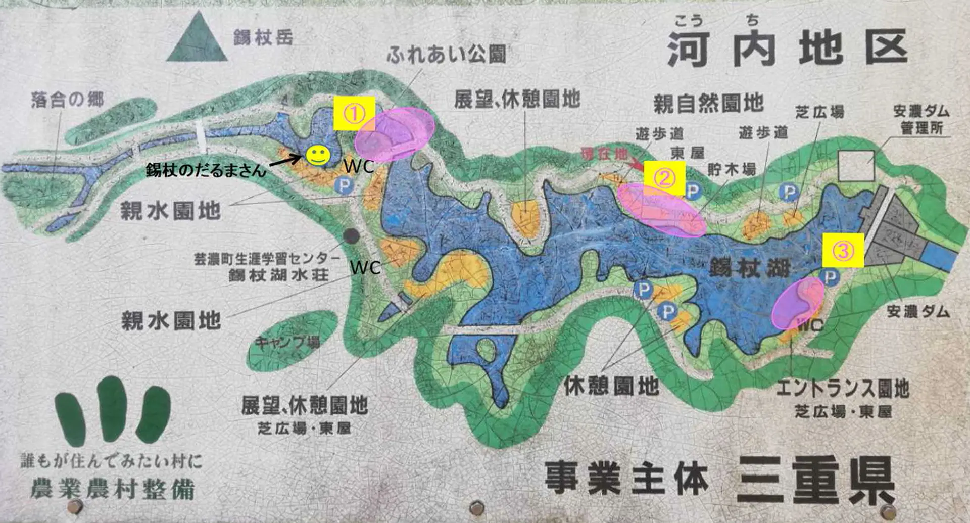 錫杖湖は上図のように、湖をとりまくように周回道路が整備されていて、上の写真は、①のふれあい公園からのものですが、この辺りにはテニスコートや宿泊施設「錫杖湖水荘」があり、錫杖湖観光の中心ともいえるところです。