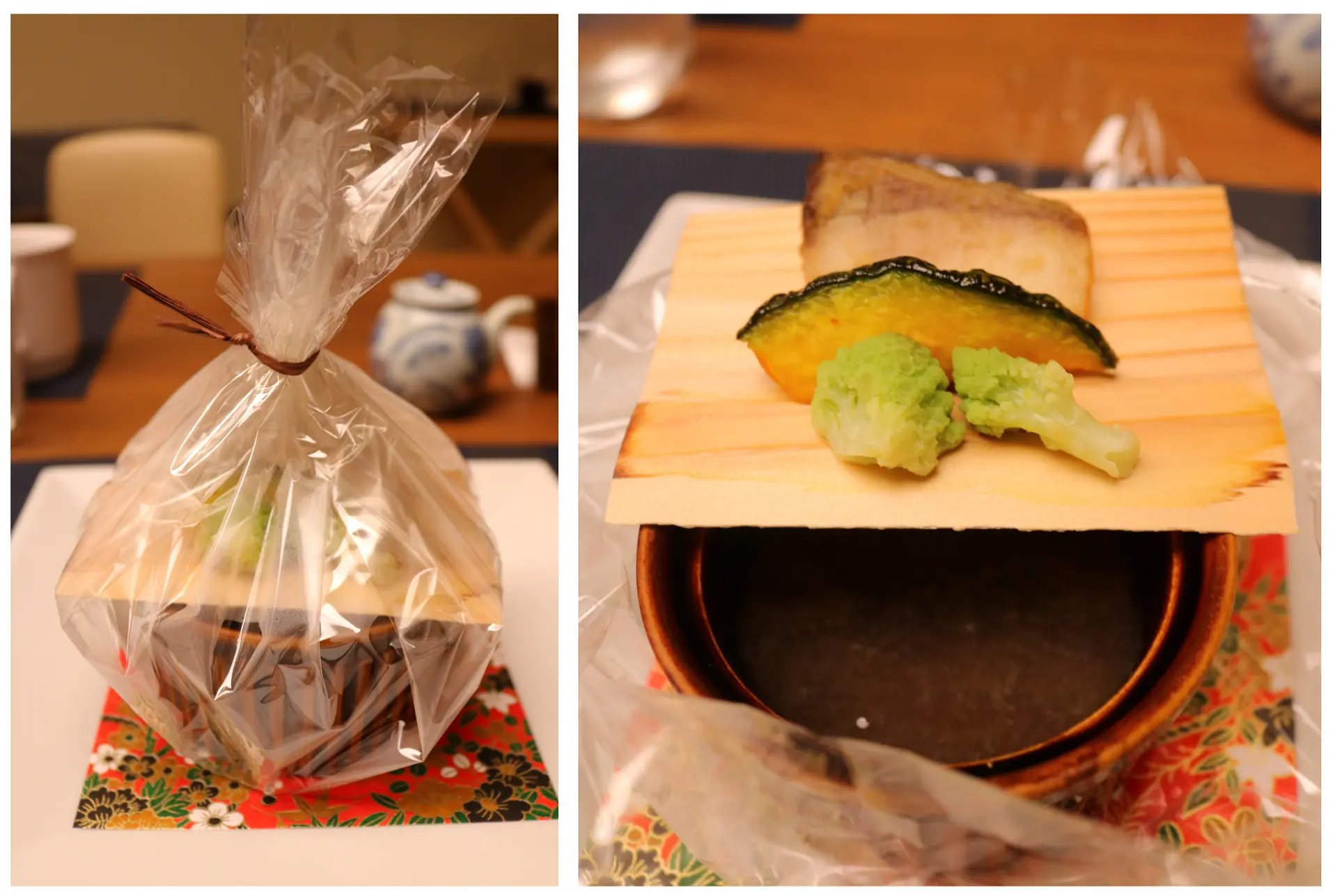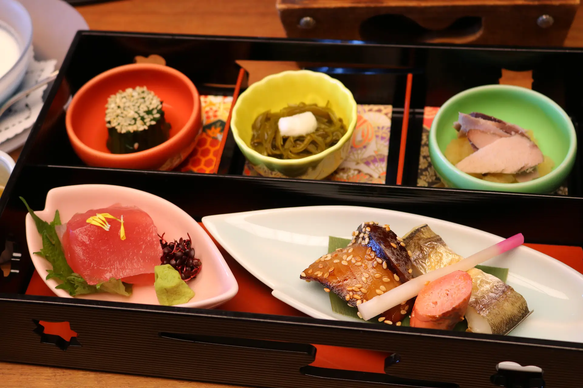 美しく盛り付けられた会席箱には、ぶりのみりん干し、かますの干物などのお魚や、びんちょう鮪のお造りもあり、とっても美味しかったです!