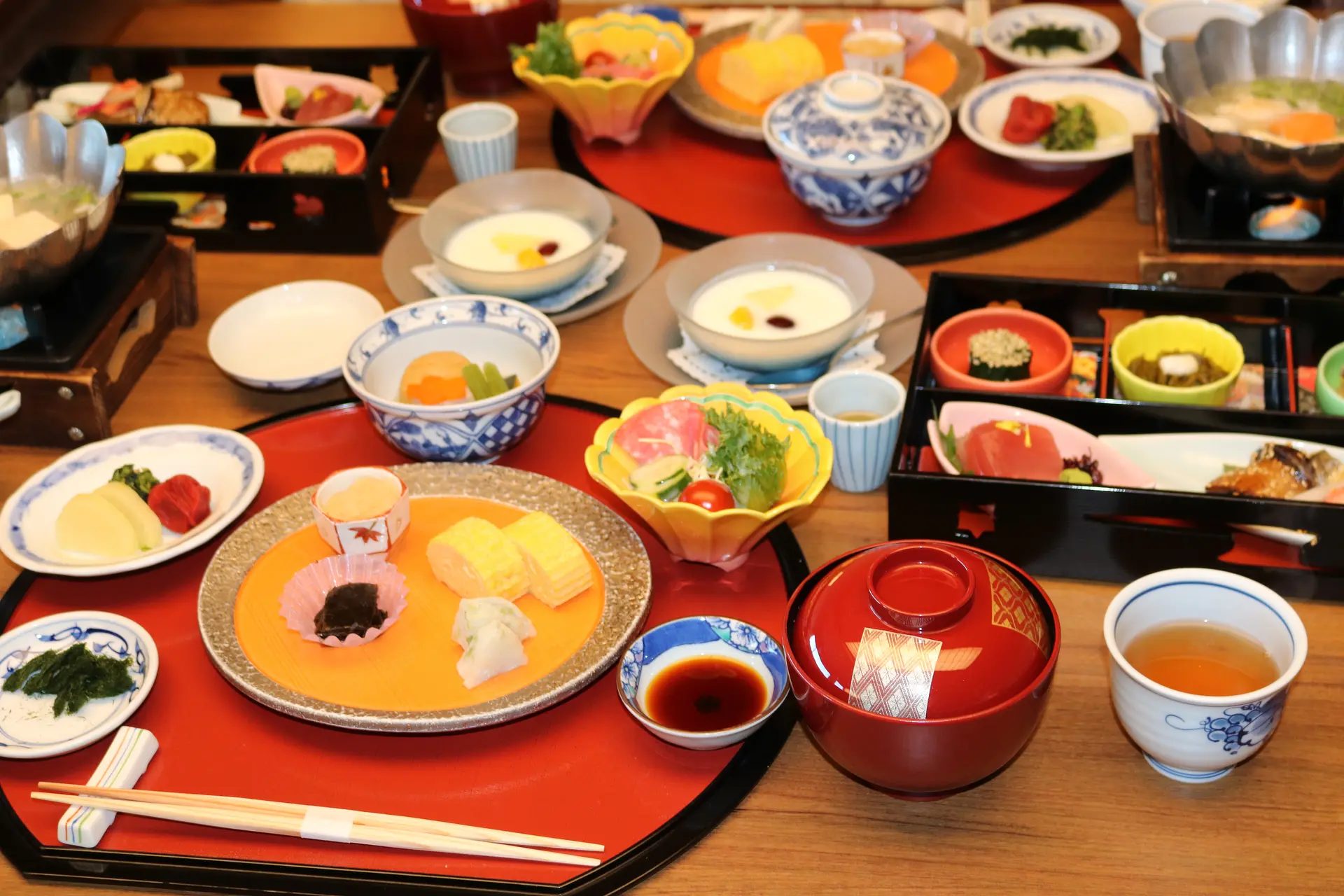 だし巻き卵、あおさのはんぺん、昆布の佃煮、野菜の煮物、サラダなど、朝にピッタリな美しい和定食が並びます。