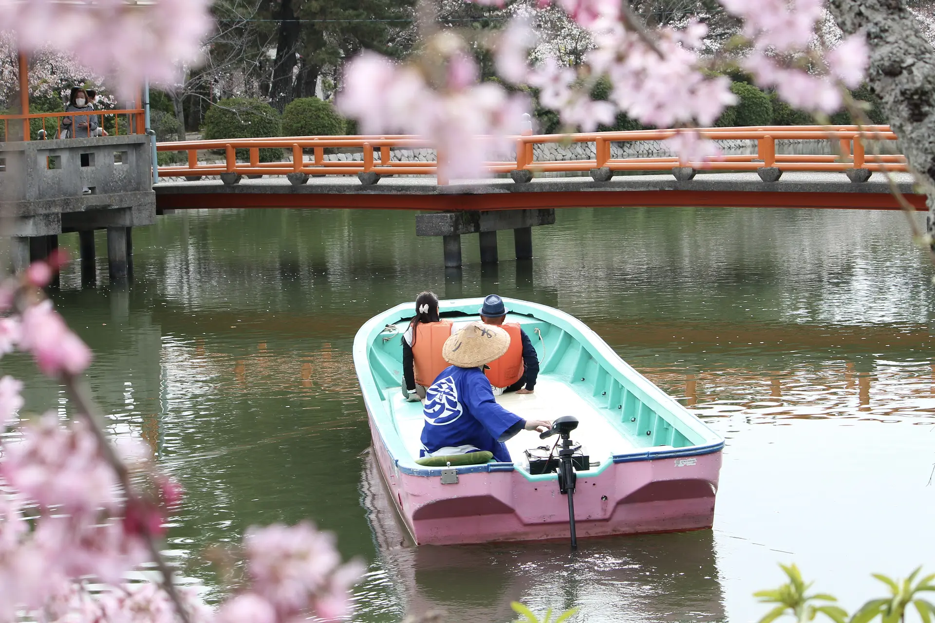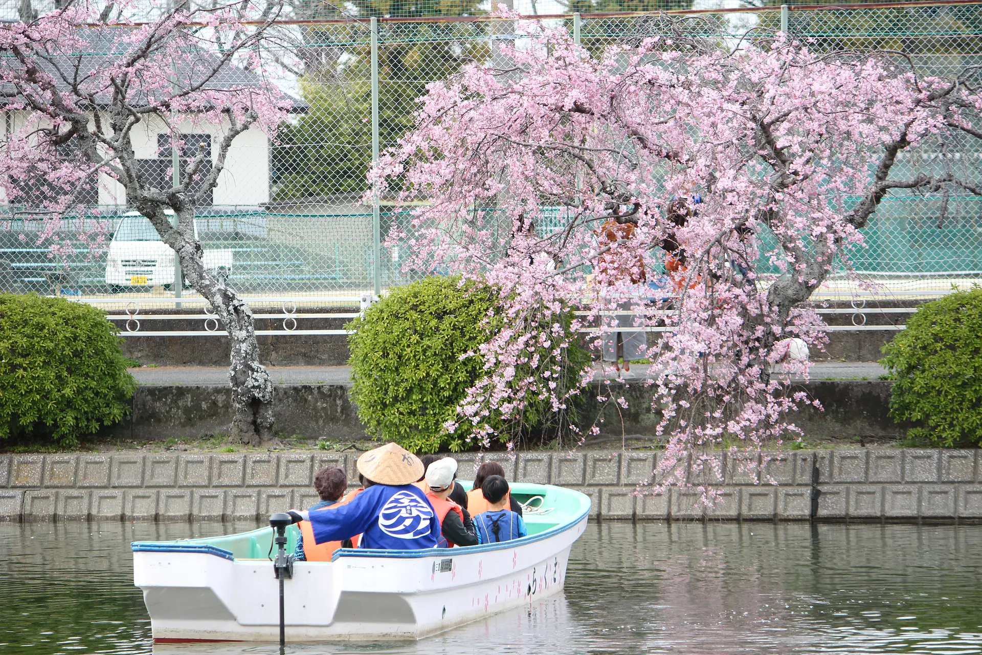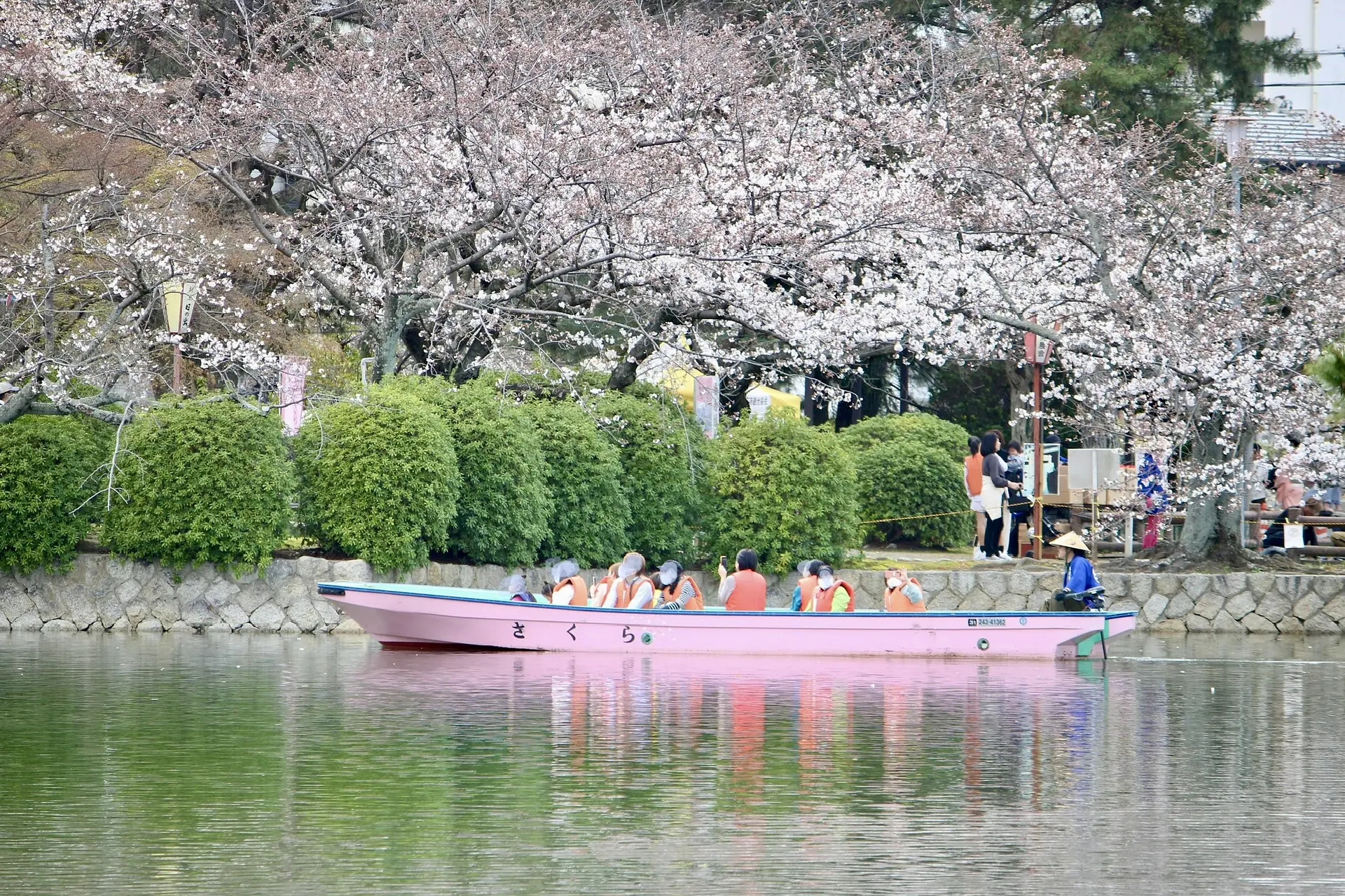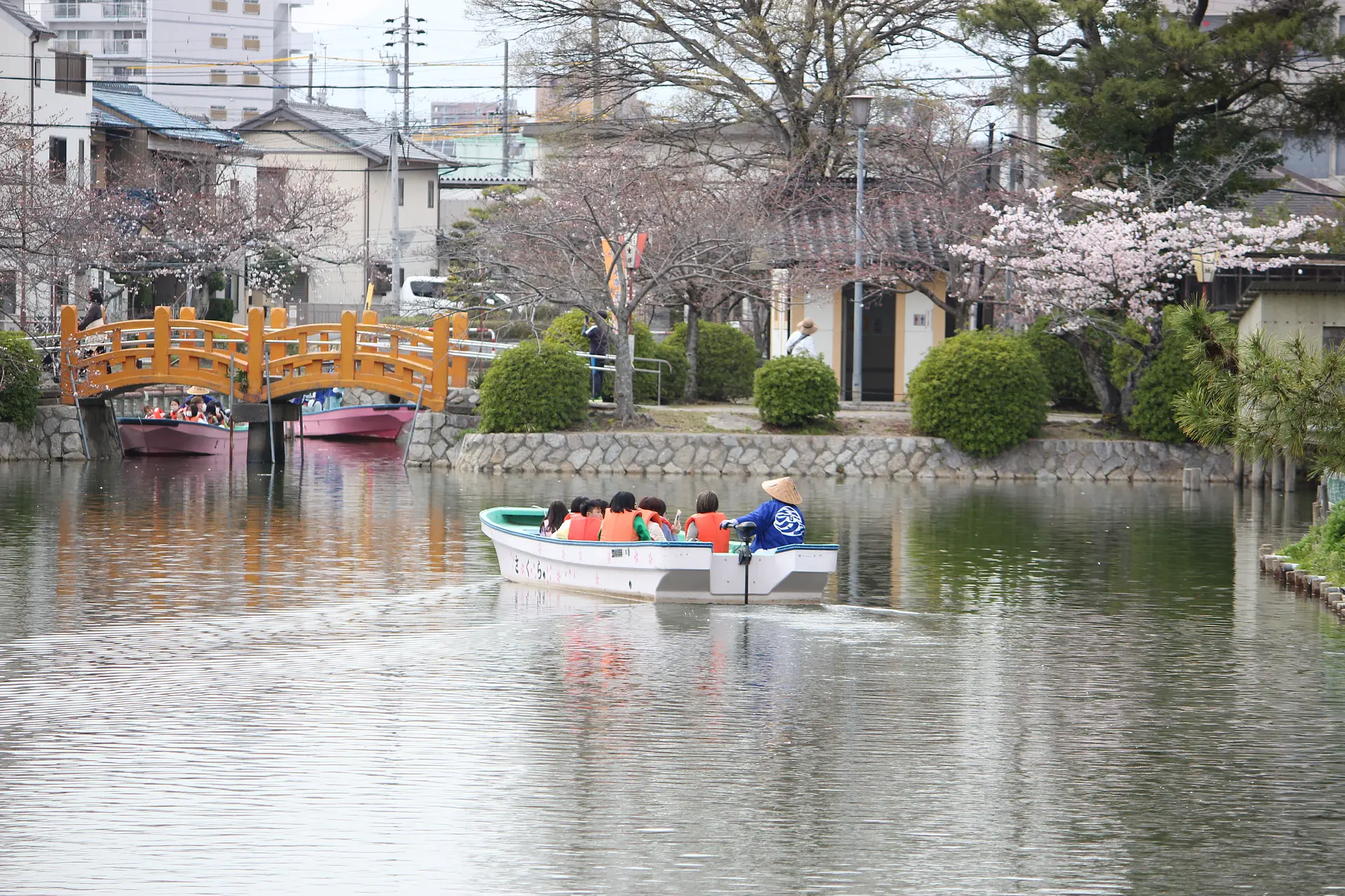 舟に乗って約15分間の優雅なお花見ができます。地上とは違う角度から観る桜も格別です♪ このように舟で花見ができるのは九華公園ならでは。