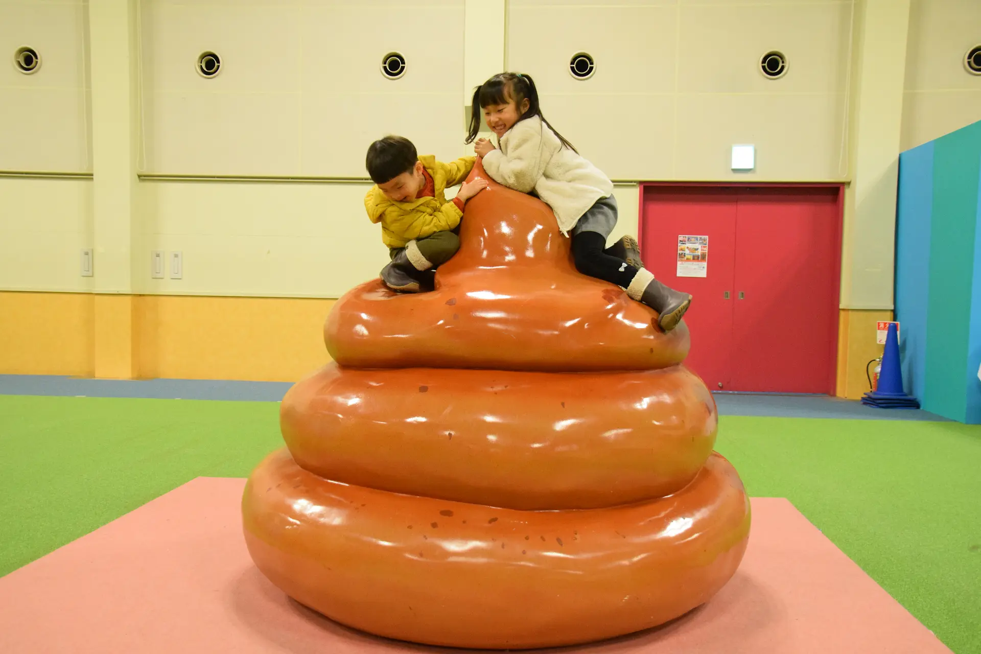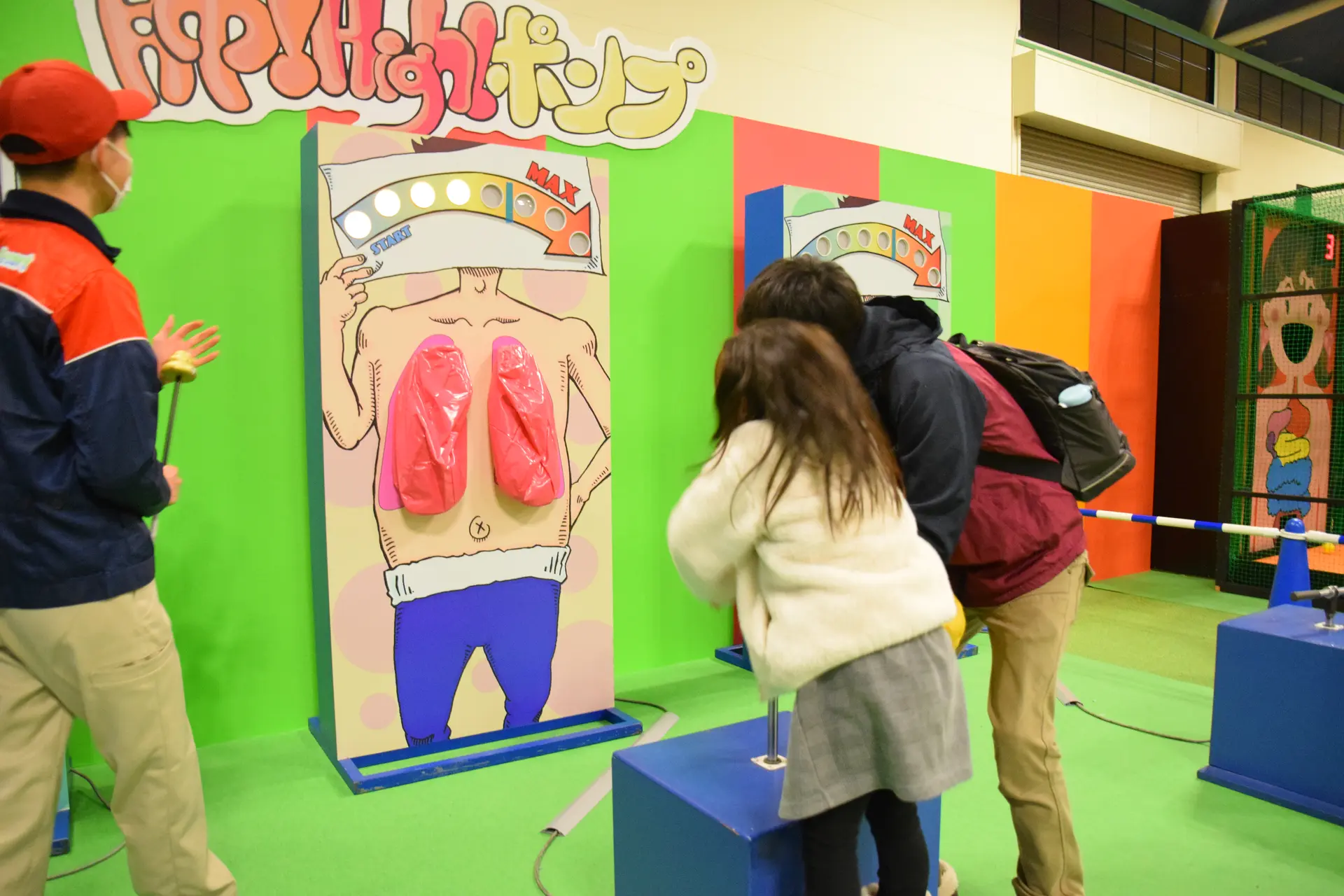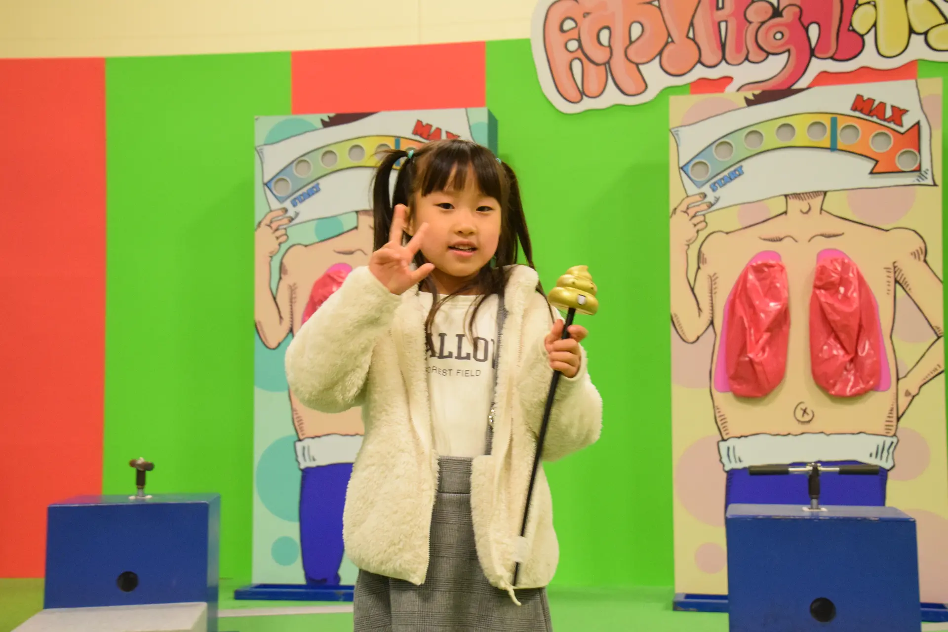 くしゃみの勢いを体感できるマシン(画像1枚目)をはじめ、心臓の音を聞いてどの動物かを当てるクイズ「心拍音クイズ」(画像2枚目)、胃袋に向かって食べ物に見立てたボールを転がす「胃のなかコロコロ」(画像3枚目)、お尻の形をした滑り台(画像4枚目)、フォトスポットの巨大な「うんち像」(画像5枚目)など、からだにまつわるアトラクションが盛りだくさんです。