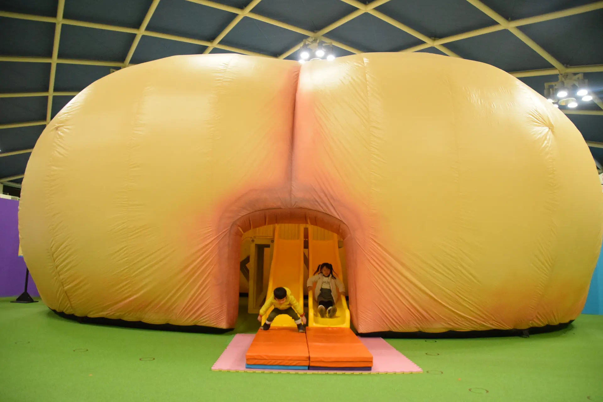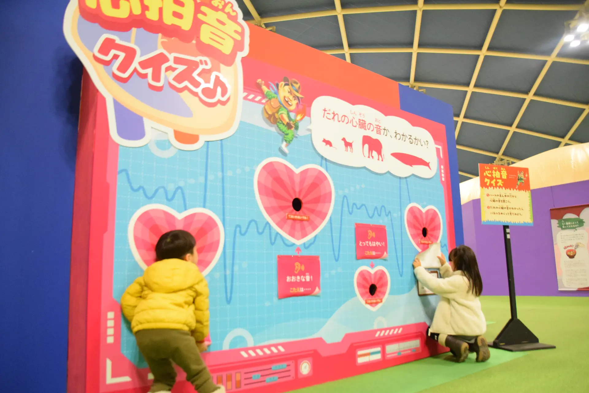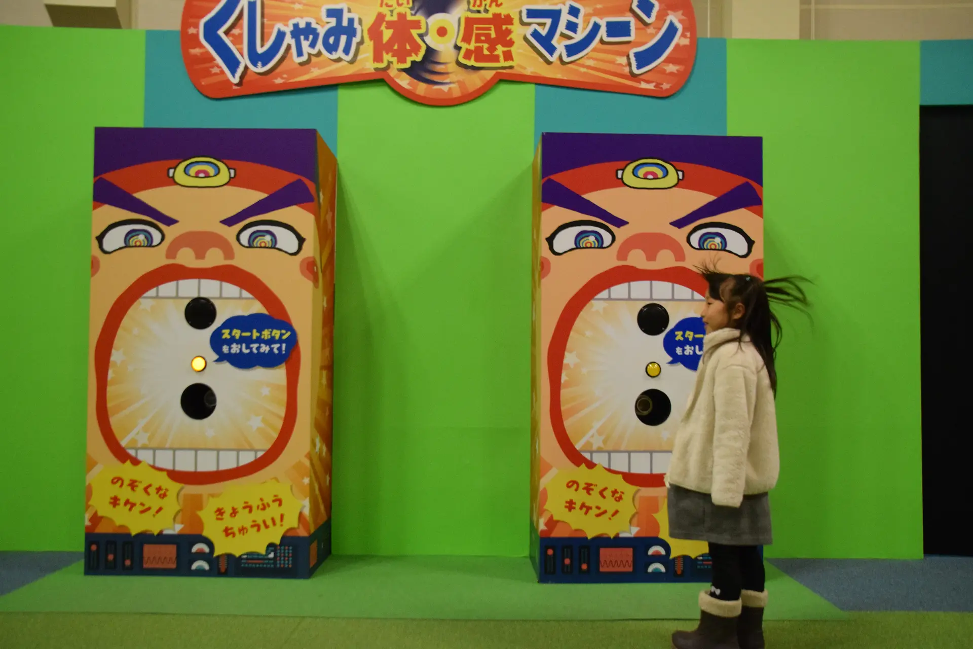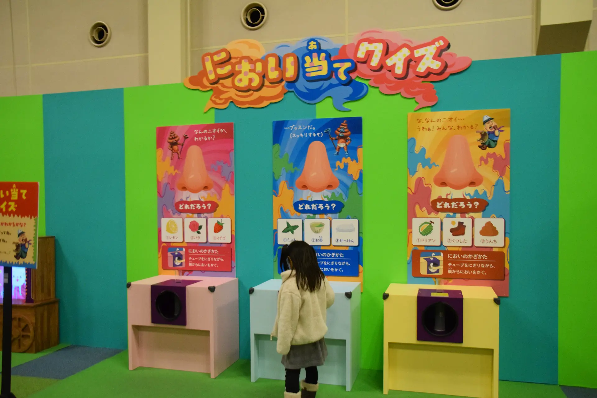 くしゃみの勢いを体感できるマシン(画像1枚目)をはじめ、心臓の音を聞いてどの動物かを当てるクイズ「心拍音クイズ」(画像2枚目)、胃袋に向かって食べ物に見立てたボールを転がす「胃のなかコロコロ」(画像3枚目)、お尻の形をした滑り台(画像4枚目)、フォトスポットの巨大な「うんち像」(画像5枚目)など、からだにまつわるアトラクションが盛りだくさんです。