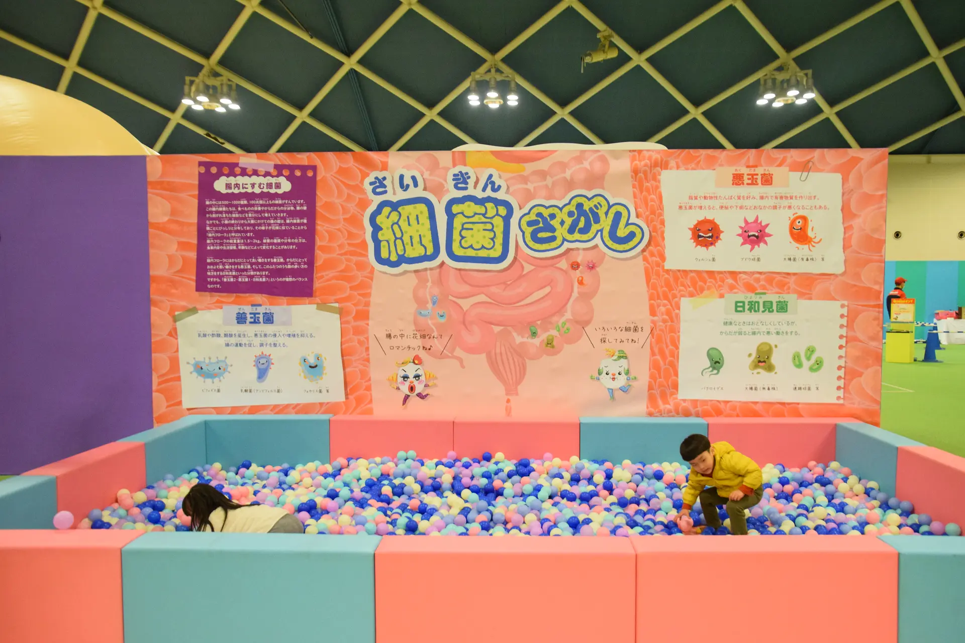 まるで手術執刀体験?シゲキのからだから臓器を取り出すゲーム「臓器つかみ隊」(画像6枚目)は、テーブルの高さが2種類あり、小さい子でも遊びやすく、他にも靴を脱いで遊べるボールプール「細菌さがし」(画像7枚目)などがありました。