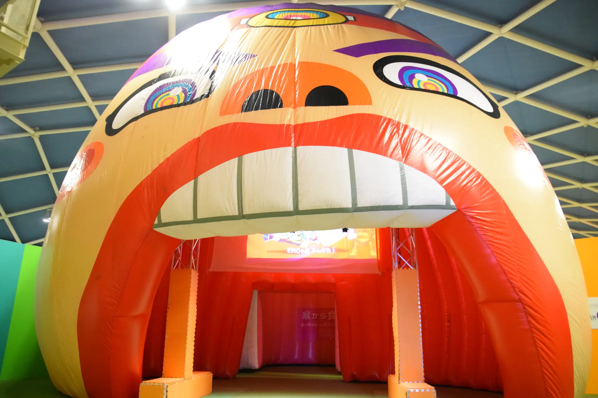 本イベントのキャラクター「シゲキ」の口の中に入っていく大型のフワフワ。なんだかワクワクしますね!