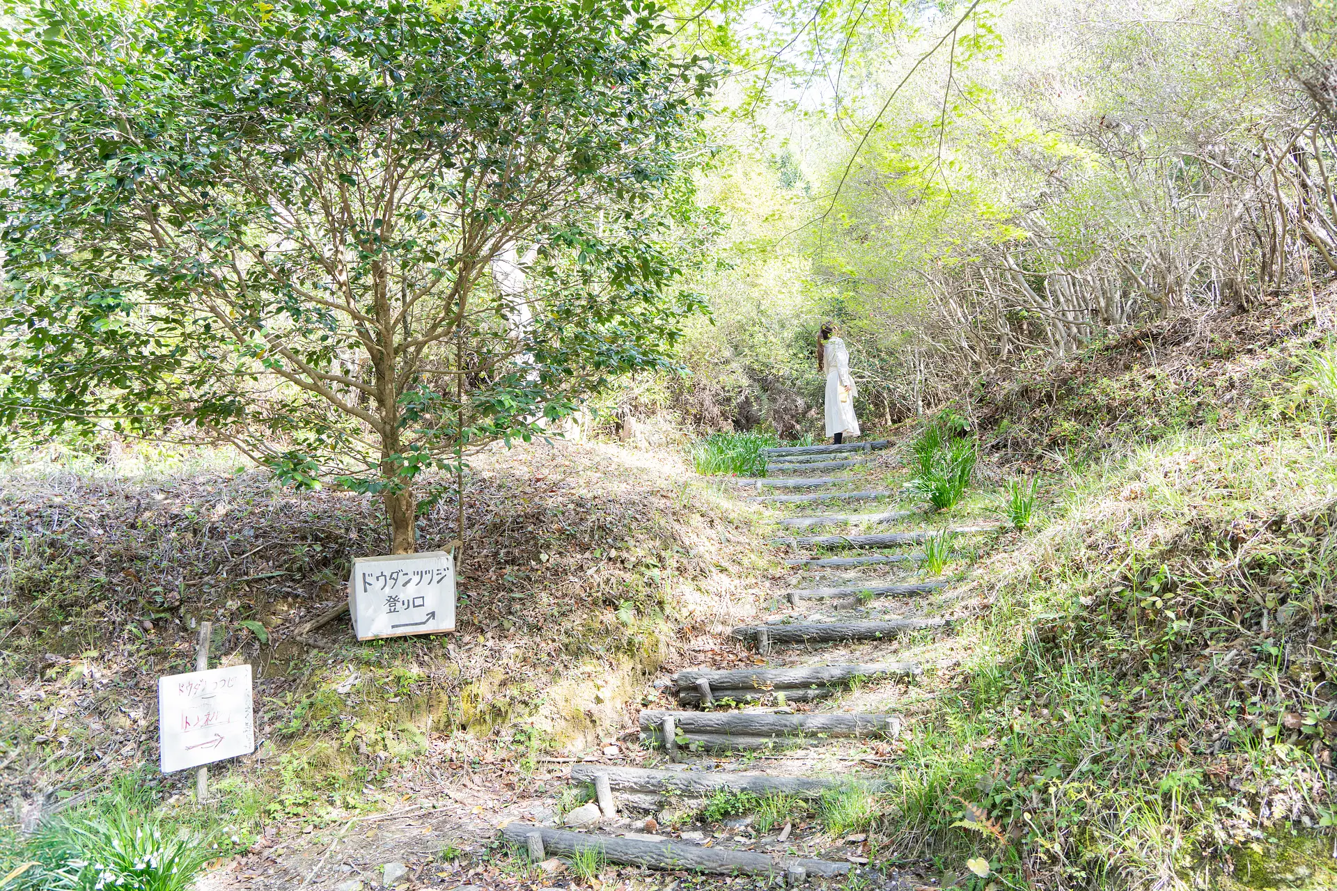ドウダンツツジのトンネルへの行き方は、登り口に設置されたこの看板が目印です。花咲く「トトロの森」をぜひお楽しみください。