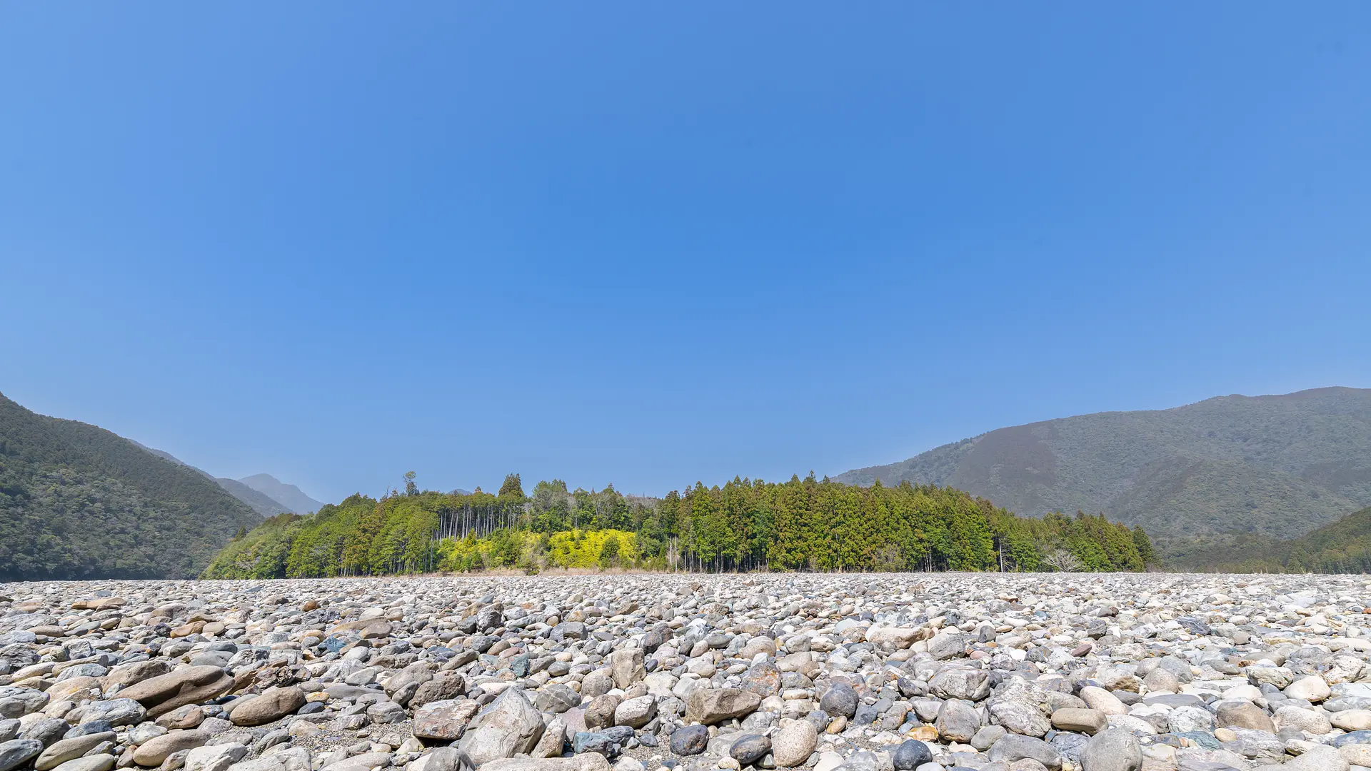 山々に囲まれた景色、歴史を感じる石積み、川を使った生活の跡、そして熊野を代表する果物であるみかん畑と、都市から離れた田舎の原風景が広がります。