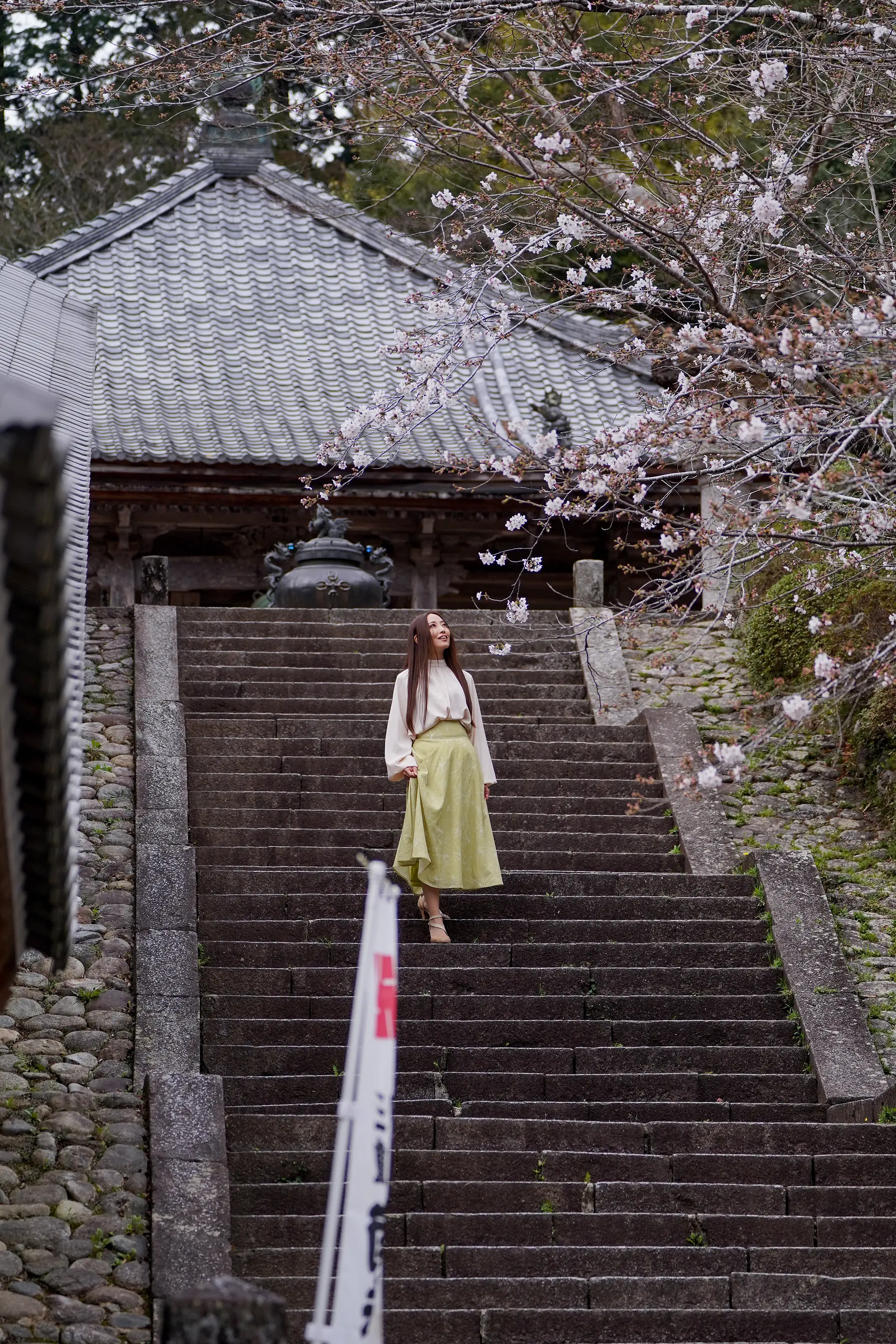 2024年3月31日現在、手前の大きな桜はほぼ満開でした。階段サイドの桜の花は3部咲き程度。素敵な写真でしょう?この日はみえ旅アンバサダー・さんぺいさんと一緒にお出かけし、撮影していただきました。