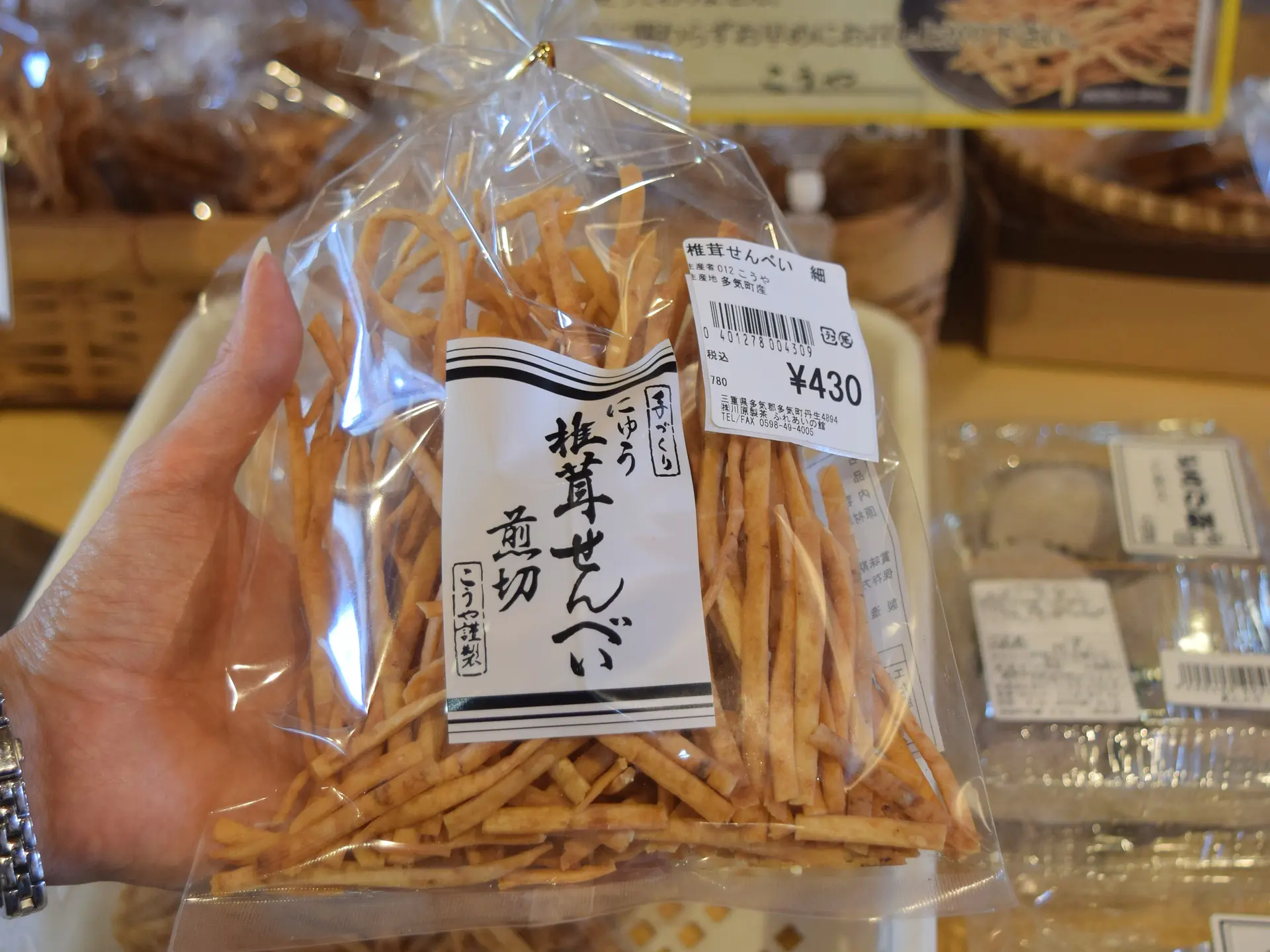 過去にはお菓子屋さんがいくつもあったという丹生。現在は生産者が減少しているといいます。「椎茸せんべい」は丹生で作られる人気のお菓子。一度食べるとクセになる風味と歯ごたえです。